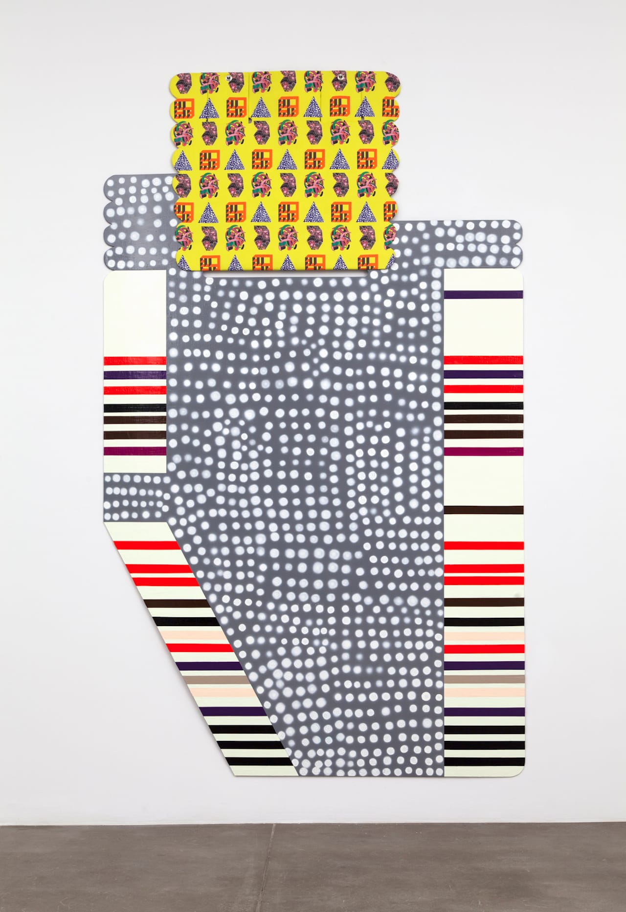 There is a visual frisson in the juxtaposition of mechanically reproduced patterns on the fabric and the repeated stripes, dots and geometric shapes applied to surface of the Plexiglas sheet. Another tremor occurs in the perceptual shift that occurs when the stripes, which rise unimpeded from the Plexiglas’ bottom edge, are halted by patterned fabric. The field of differently sized, spray-painted dots, with their fuzzy edges, compliments the soft fabric. The constantly changing relationship between difference and similarity is one of the focal points of these new works.
