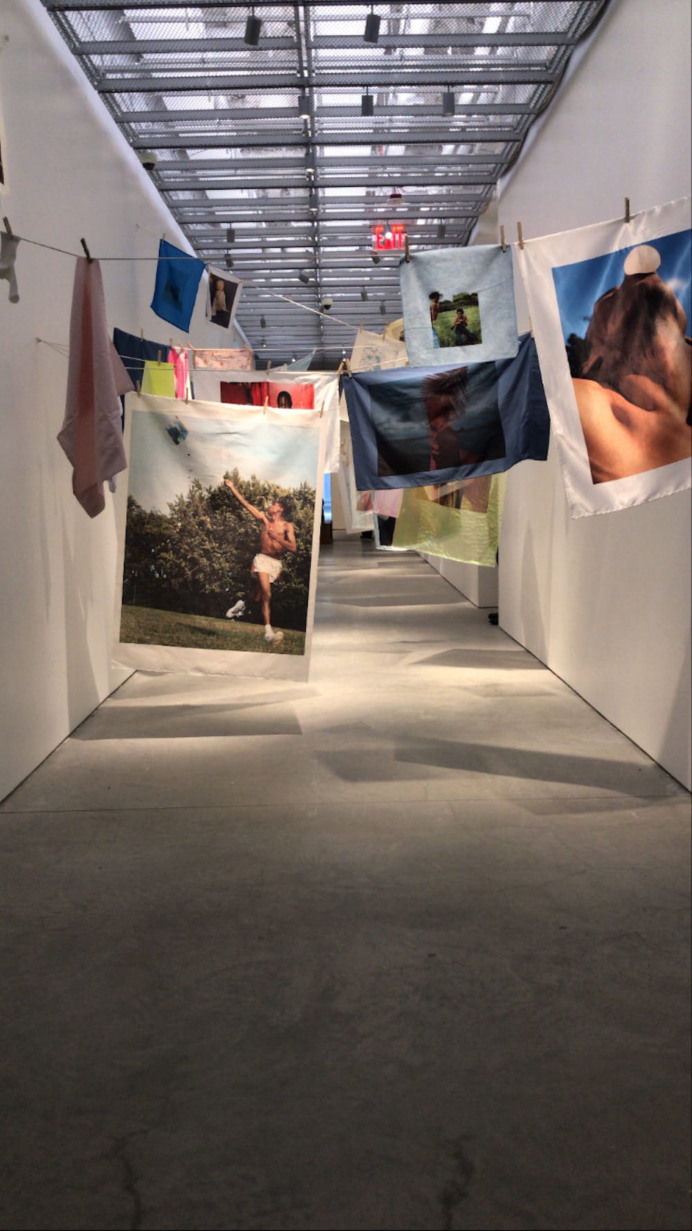 The last section of the exhibition is most reminiscent of the Mitchell the mainstream public knows. Draped across the ICP hallway are mostly posed photographs, in which the subject looks directly at the camera, printed on pillowcases, silk scarves, and linens that hang from a trail of laundry lines — a symbolic device referencing domestic labor. Both the photographs and the installation itself showcase what he’s best at — intimate portraits presented in an interesting, rich, and welcoming color palette.