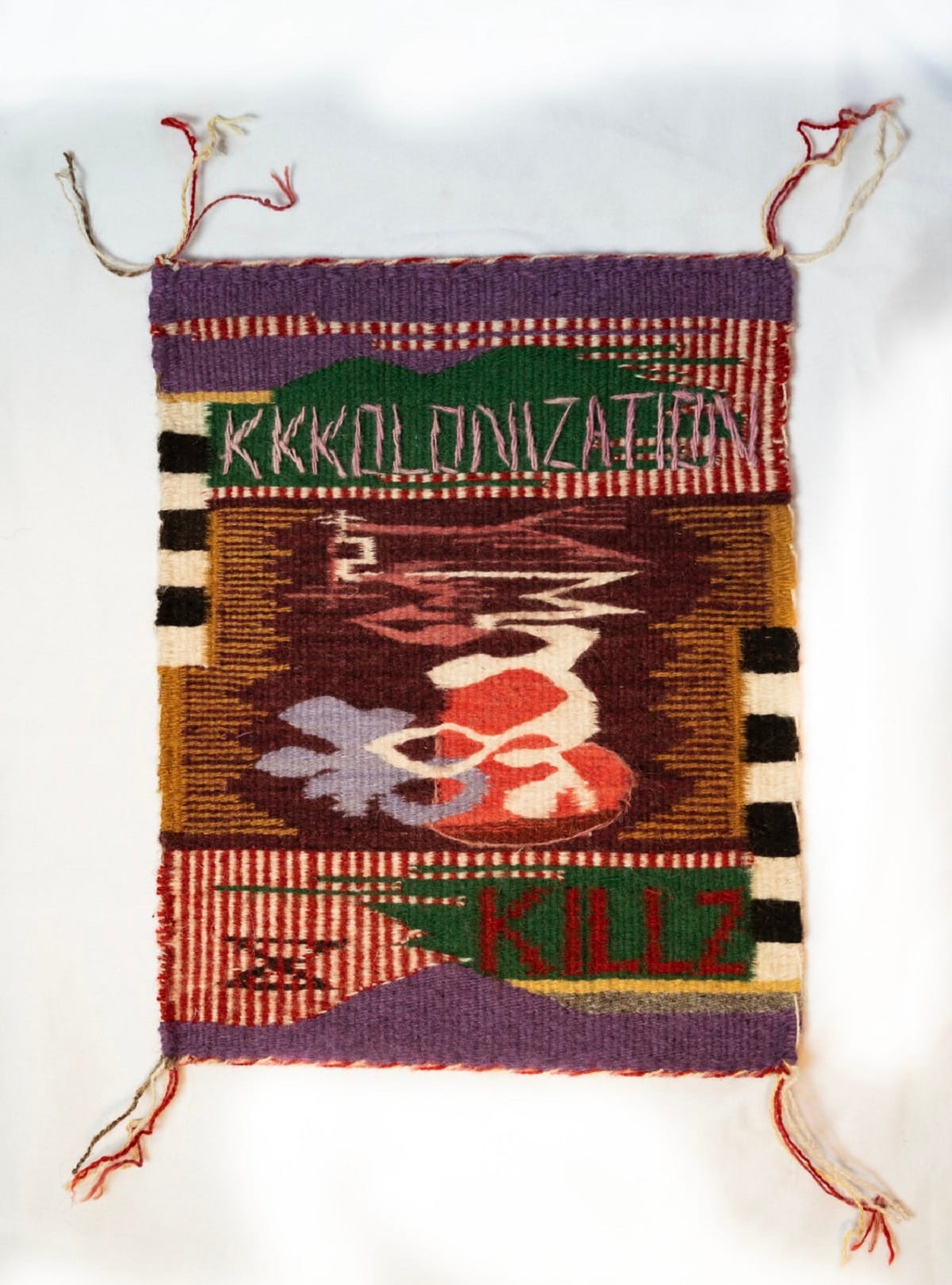 Tyrell Tapaha, "Think for Yourself" (2022), Diné-style tapestry, handspun and commercial vegetal-dyed Navajo Churro/alpaca, 3 1/2 × 5 feet (photo Dawson Peters)