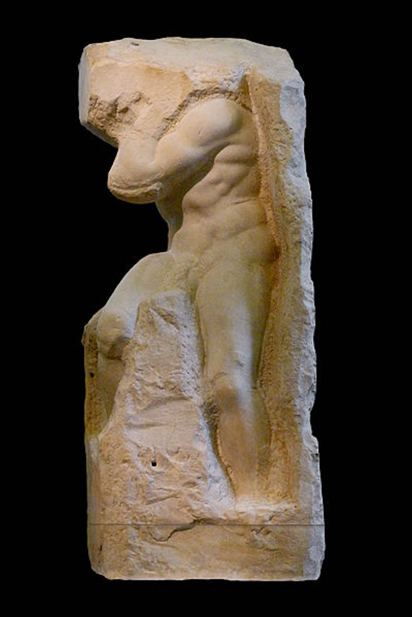 “ATLAS” also features a number of references to Michelangelo’s unfinished slave sculptures, most obviously “Atlas Slave.” Both sculptures are named after the Greek god said to have carried the entire world on his shoulders. Mimicking the non finito style of Michelangelo’s original sculpture, Aspencrow renders McGregor in the midst of his creation. There’s also a slight resemblance to the Renaissance artist’s “Awakening Slave,” whose subject almost looks as if he is struggling to break free of the marble.