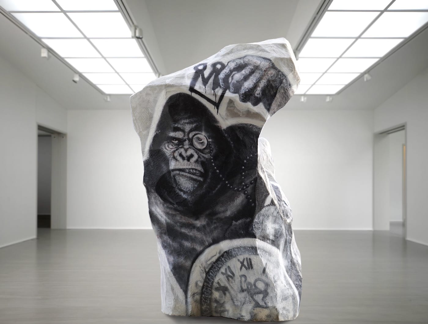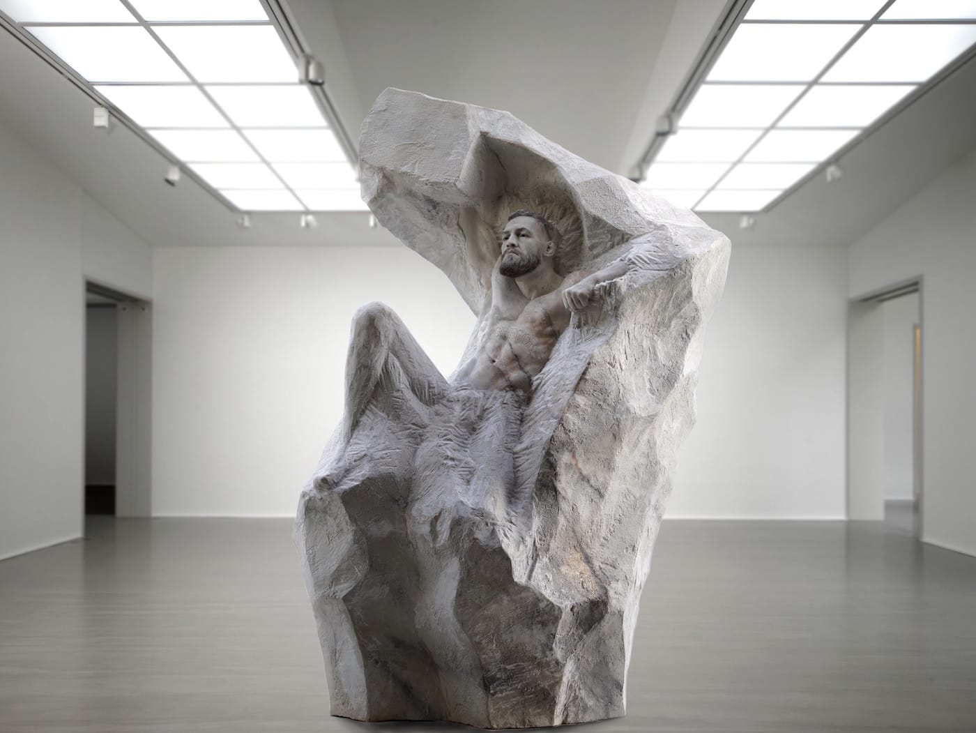 Aspencrow (the artist formally known as Edgar Askelovic) has created a larger-than-life sculpture of McGregor from platinum silicone and marble powder, on view at JD Malat Gallery in London’s Mayfair district from July 14 to September 30. Emerging from his boulder-shaped cocoon, the Lithuanian-born artist’s interpretation of the boxing champion, called “ATLAS,” is heroic yet stoic. The sculpture depicts the Irish giant as bursting out of the rocks, perhaps readying himself for a fight.
