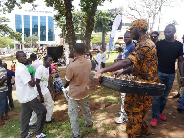 Outside AfriArt Gallery, one of Kampala’s leading galleries, was the work of British expat Sue Crozier Thorburn. Thorburn created abstractions of the equatorial sun (Kampala is just a short drive away from the equator) at different stages of the day. At the National Theatre, Ruganzu Bruno created a world of trash come to life, with a pondering Thinker sculpture made of a discarded TV and newspapers, among other found materials. Performance artist Waswad’s vision of an animal world he dubs “Elefania” reached surreal levels as he wandered amidst the crowd handing out coffee beans, a symbol, his assistants told me, of Ugandan unity.
