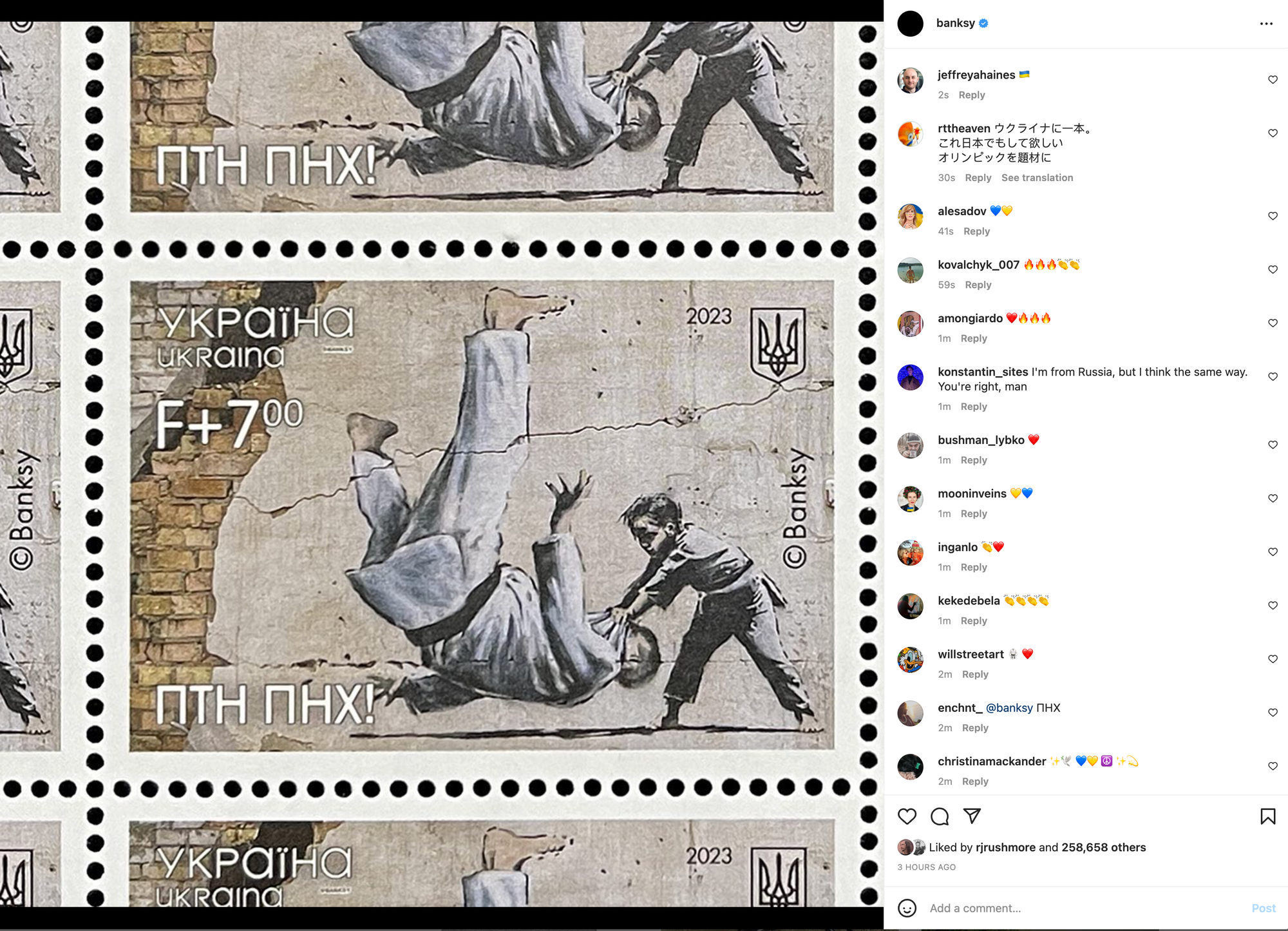 On February 24, the first anniversary of Russia's ongoing war in Ukraine, the Ukrainian postal service released a new stamp featuring a Banksy mural and the shorthand “FCK PTN!” in Cyrillic. The mural, which the British street artist painted in the fall of 2022 on a bombed building northwest of Kyiv, portrays a young boy in Judo robes flipping an older man. Many speculate Banksy depicted Vladimir Putin getting body slammed, as the Russian President is reportedly a Judo practitioner.