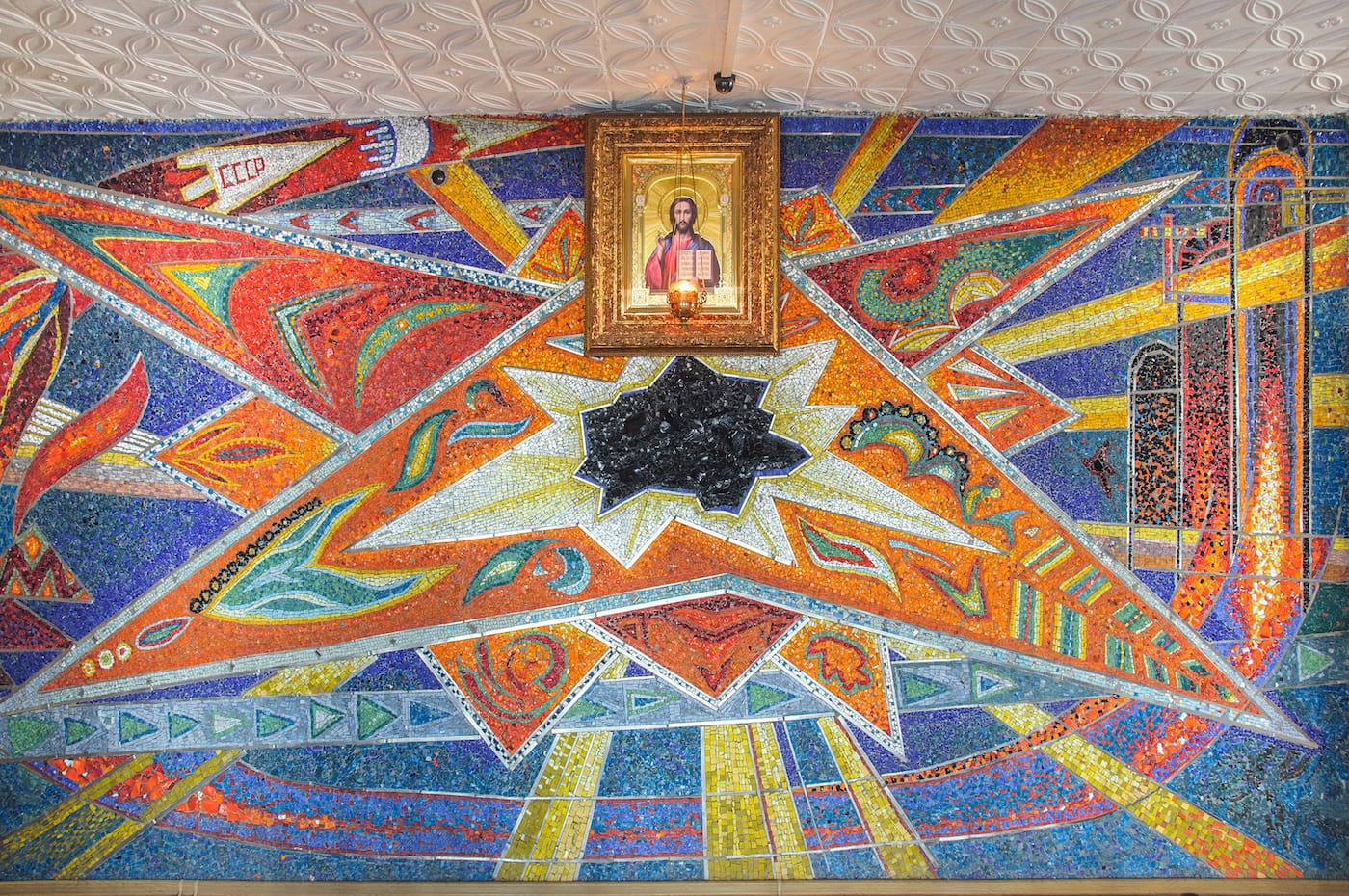 Colored smalto mosaic by an unknown artist at the Volodymyr Sosiura House of Culture, Lysychansk, published in Decommunized: Ukrainian Soviet Mosaics (photo by Yevgen Nikiforov)