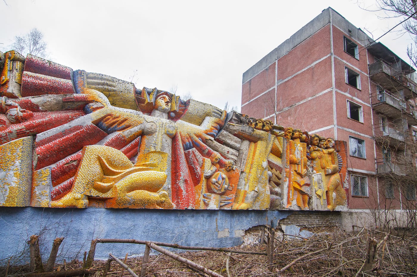Ivan Lytovchenko, “Creation” (1982) on a Strumok store, Pripyat, published in Decommunized: Ukrainian Soviet Mosaics (photo by Yevgen Nikiforov)