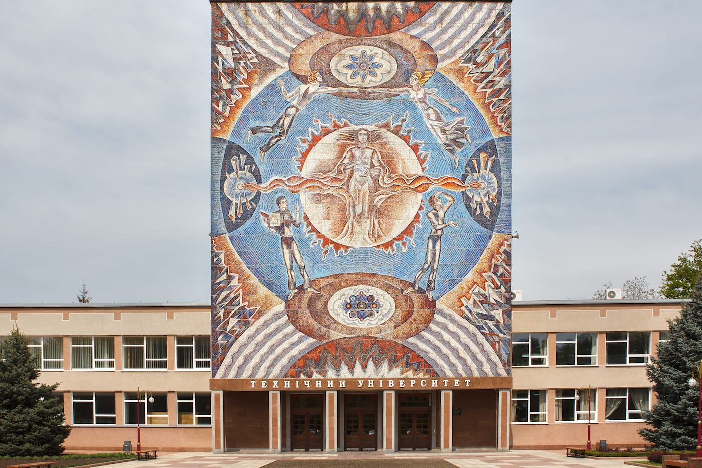1980s ceramic mosaic by H. Soldatov on Vinnytsia Interregional College №4, Vinnytsia, published in Decommunized: Ukrainian Soviet Mosaics (photo by Yevgen Nikiforov)