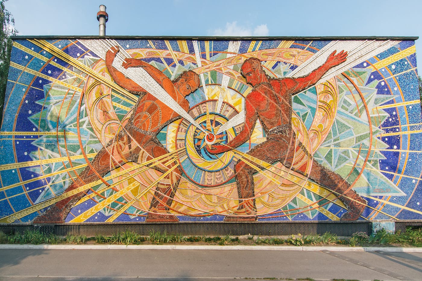 Designed and made by Soviet artists, most date to the last three decades of the USSR. They reveal a vast range, not only of topics — industrialization, history, folk motifs, leisure, and more — but also of styles and techniques. Ceramic tiles, colored smalto, and glittery designs embedded with glass shards or natural stone come together to portray heroic citizens, from focused factory workers to streamlined athletes to superhuman scientists who conquer problems allegorized as monsters. Many subjects are stylized, while some are more realistic; in one unique mosaic near the Kyiv River Port, rowers resemble the blocky figures of Egyptian hieroglyphs.