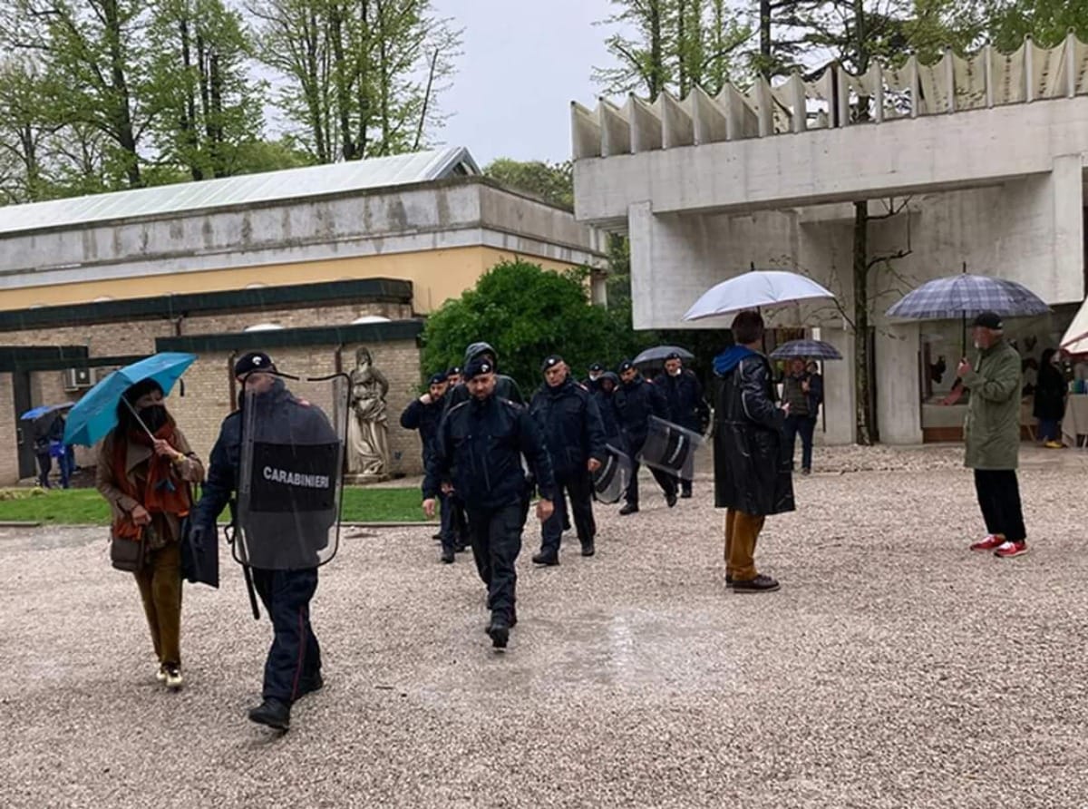 Ukrainian actor Aleksey Yudnikov was escorted away and questioned by police after staging a guerrilla protest performance in front of the Russian national pavilion at the Venice Biennale on Friday, April 22. The Russian pavilion is empty this year; artists Alexandra Sukhareva and Kirill Savchenkov and curator Raimundas Malašauskas withdrew from the show in February after Russian troops invaded Ukraine.
