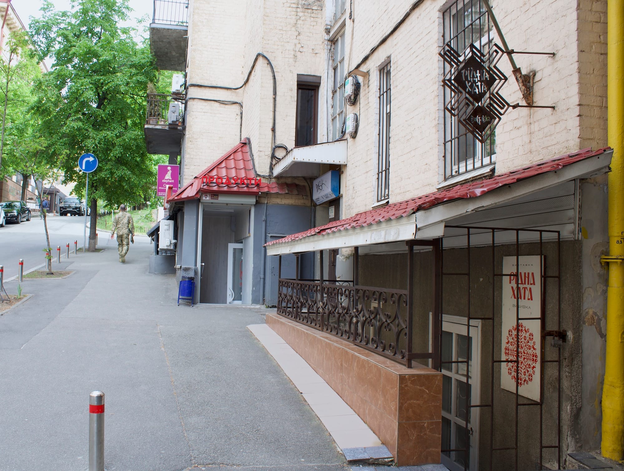 As we descend the steps to the entrance, past a sign depicting a traditional red-and-white vyshyvka (embroidery) pattern, Sholudko translates Zarembska’s musings on the days when she was one of a dozen artists who called this street home in the 1990s, before it became more financially challenging to survive as an artist. Now, she says, she's the only Ukrainian folk artist remaining in the neighborhood.