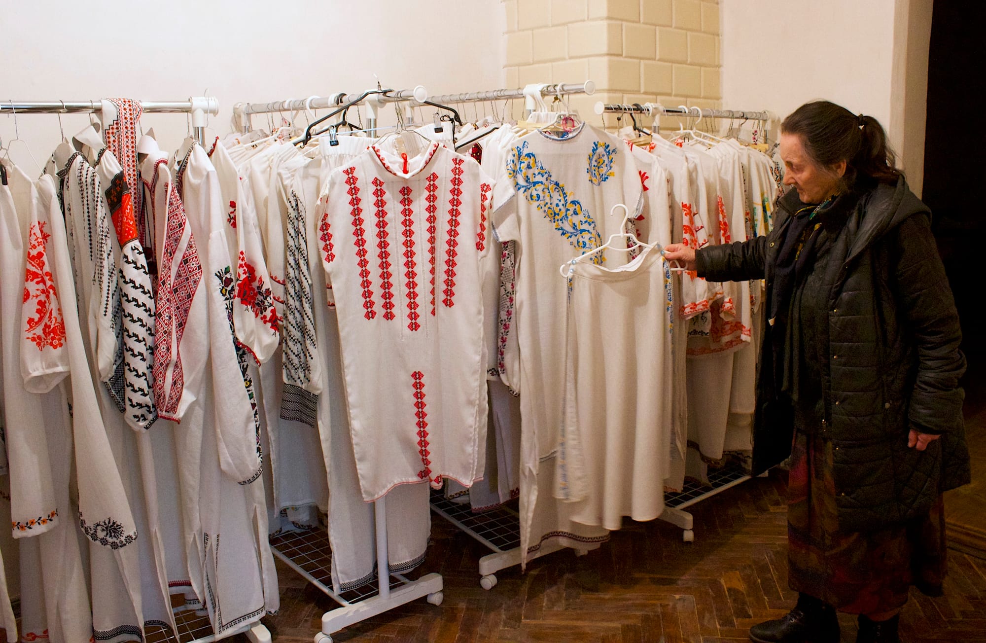 Inside Zarembska’s small museum, open daily in the afternoons, white blouses adorned with intricate red and black stitches hang along the walls of the first of three rooms. These are vyshyvanka, embroidered shirts typical of Ukraine’s national garb. The patterns adorning each piece of clothing can vary by region and artist, but often feature folk symbols like diamonds representing fertility and stars signifying protection.