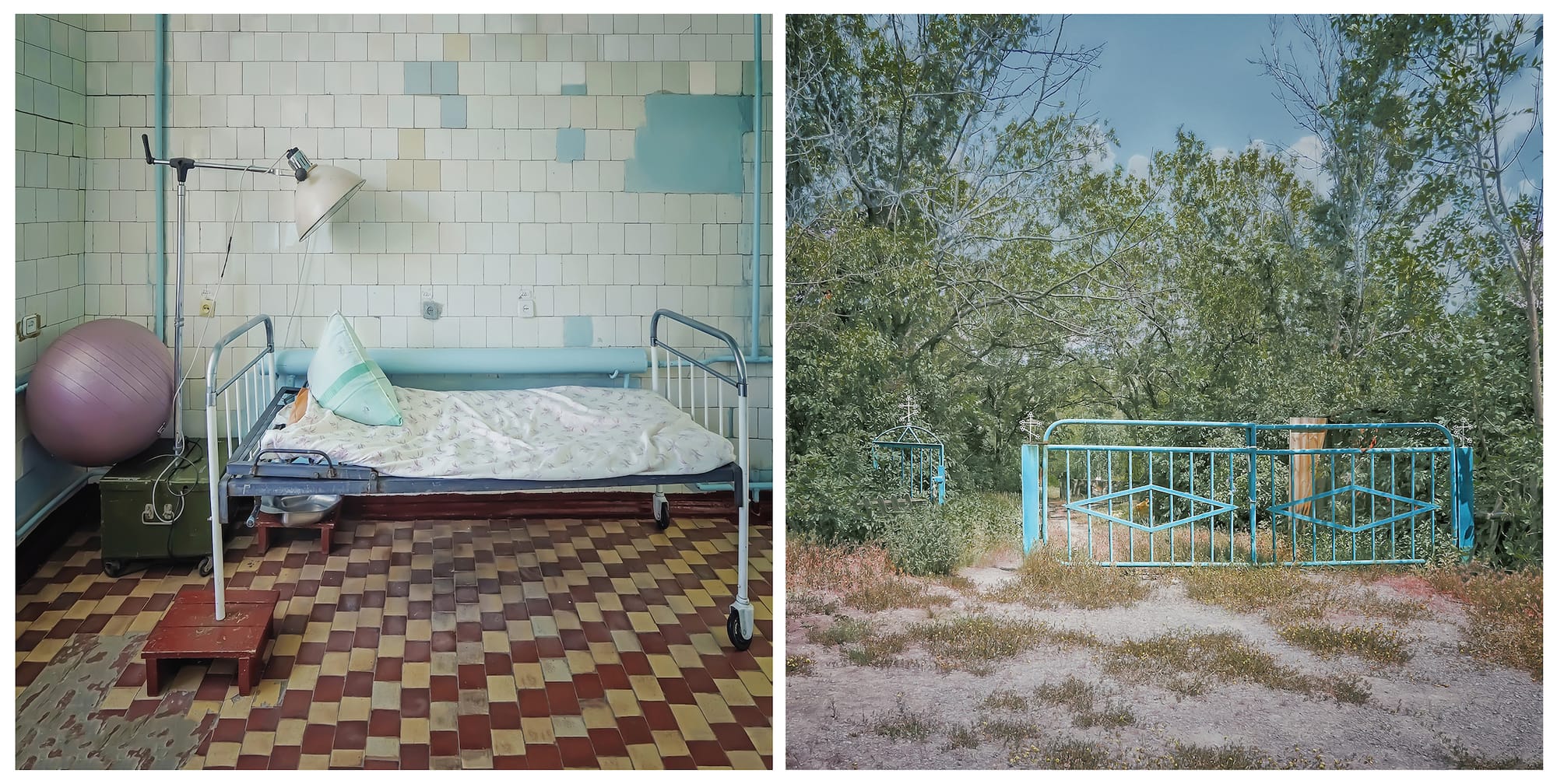 War is omnipresent in powerful diptychs by Alena Grom, a documentary photographer who was born in Donetsk and fled the Donbas region in 2014. Each photograph displays the formalist detachment of someone who has been made an outsider in her own land, combined with the deep sympathy and identification of a native who has watched Russia’s destruction and merciless repression of her own region and people. The diptychs, from the series Pendulum, pair an image of a wartime ruin with a child’s portrait. The one exception is a bleak Soviet-era hospital ward set against an image of an Orthodox cemetery. The cemetery’s rounded, blue-green gate echoes the ward’s metal bed in shape and color — the two silent tableaux hinting at the interconnection that exists between their spaces.