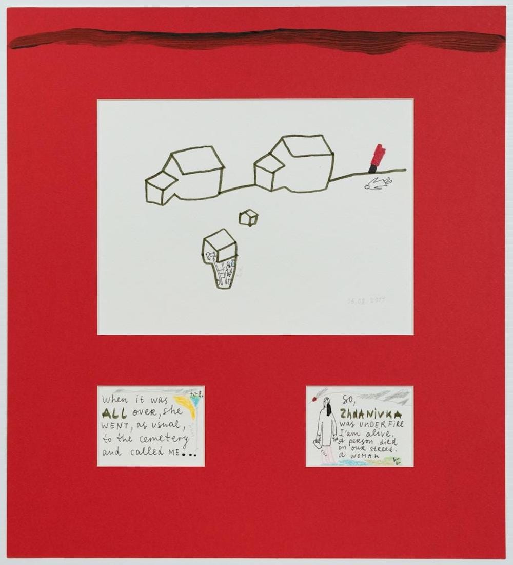 Dana Kavelina’s masterful drawings from the series Communications. Exit to the Blind Spot (2019), based on the artist’s research into "rape camps" established by the Serbs in Bosnia and Herzegovina in the 1990s, are poignant and precise in their portrayals of pain. The artist looks at destroyed identities of raped women forever traumatized by forced pregnancies, necessary abortions, and the postmemory. Kavelina’s “ Letter to a Turtledove”(2020) — a brilliant experimental stream-of-consciousness poem in the form of a film — features a female protagonist meandering among archival footage of the Donbas region of Ukraine. The work bridges a gap of a century, and tragedies that the area has continuously endured.