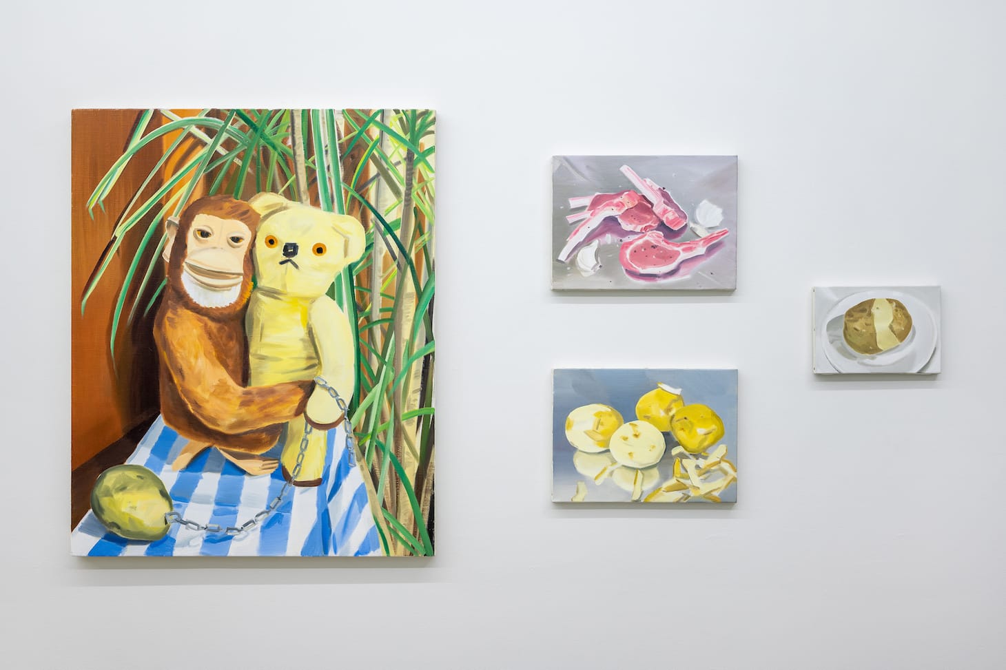 The latter shows the couple on a walk with their pet: a potato attached to a chain draped over the bear’s paw; a blue-and-white striped tablecloth provides a pathway and bamboo plant becomes the foliage around them. In relation to the wildly grinning monkey’s oppressive embrace of the hapless bear, the “pet” potato doubles as a darkly comic send-up of a partner as a “ball and chain.”