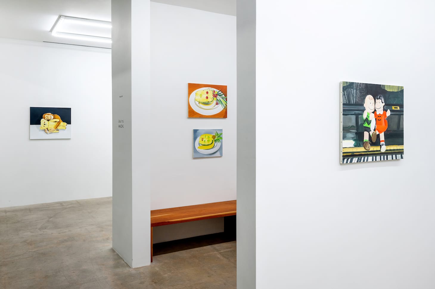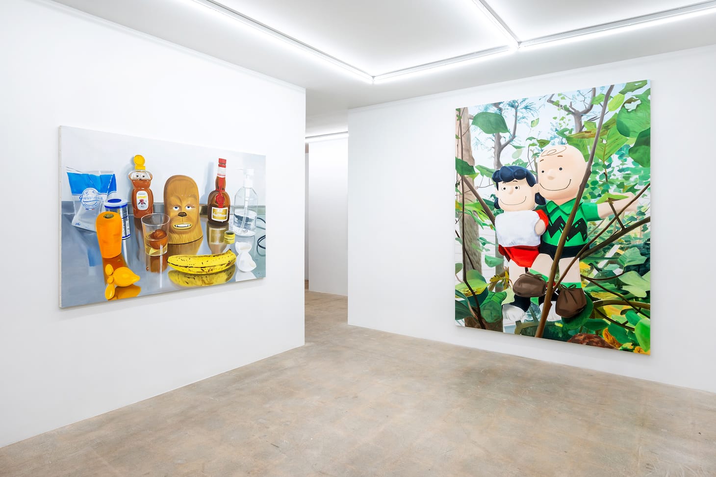 Nearby, three large paintings centered on Charlie Brown and Lucy van Pelt cast the Peanuts characters as friends and lovers. The Peanuts paintings activate the emotional tension that pervades the show. They could depict a fantasy of reconciliation between the two, whose relationship in the comic strip is usually adversarial. Yet it’s nearly impossible for anyone who knows the cartoons to miss their history of antagonism and angst.