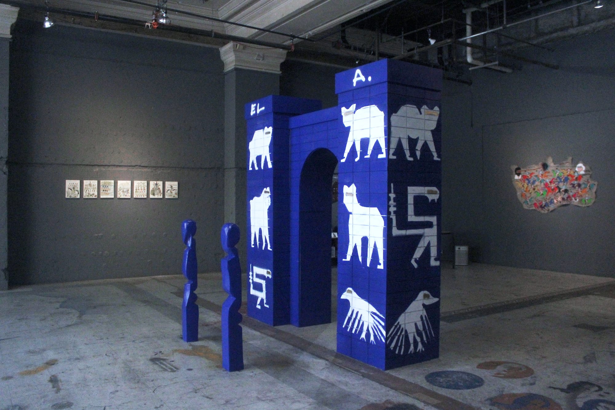LOS ANGELES — The Ishtar Gate is painted Dodger blue, the shade named after the Los Angeles baseball team. Instead of lions and dragons, Umar Rashid’s recreation of the ancient Babylonian passageway features pitbulls and rattlesnakes as its sacred protectors. PER CAPITA, Rashid’s solo exhibition at Transformative Arts, is a playful, but critical, tribute to Los Angeles that rewrites its colonial history.