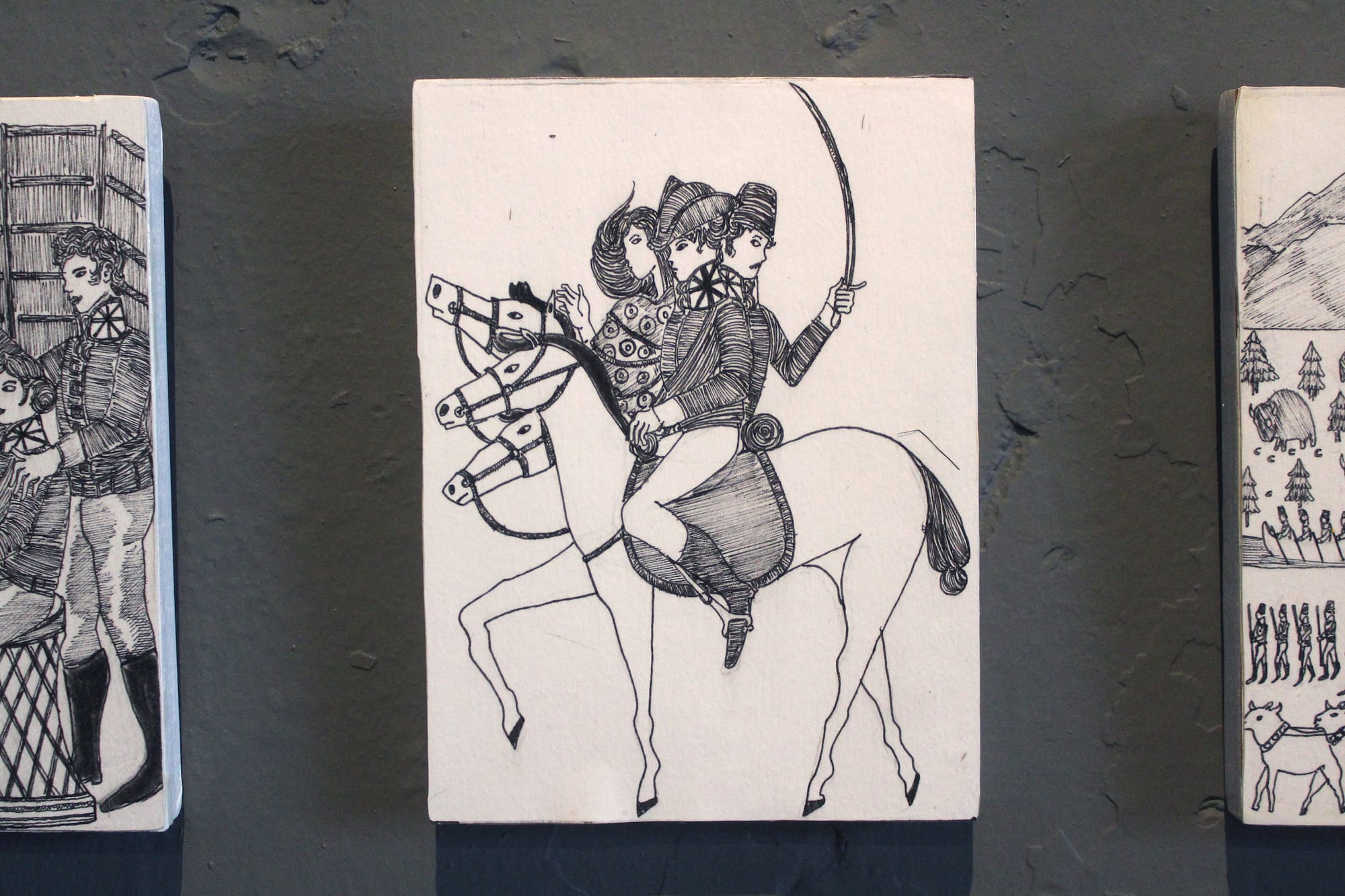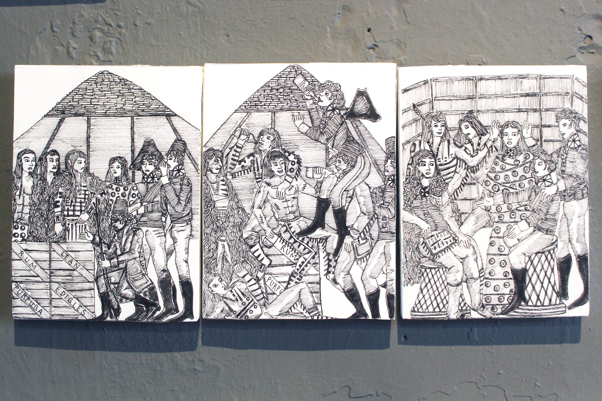 The series of drawings 40 Views of Colonial Fabric Softener (2019) reimagines the story of westward expansion. Instead of Lewis and Clarke and Sacagewea, our protagonists are Sydney and St. Marc and Mugwayan. Over 40 pages, drawn simplistically and reminiscent of a City Hall mural, the explorers — described as “trespassers” in Rashid’s titles — trade poison, poach bison, and attack Dakota warriors.