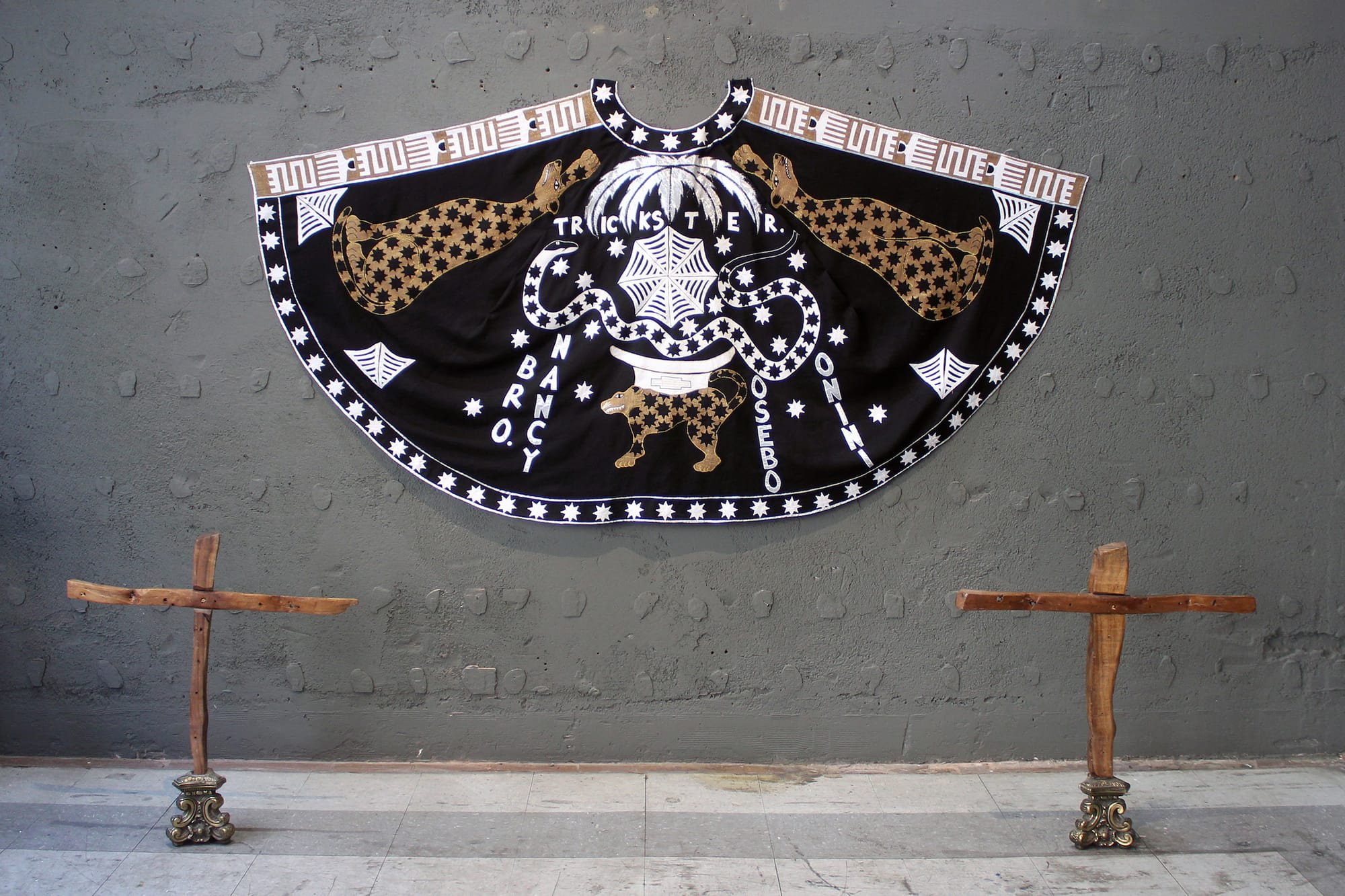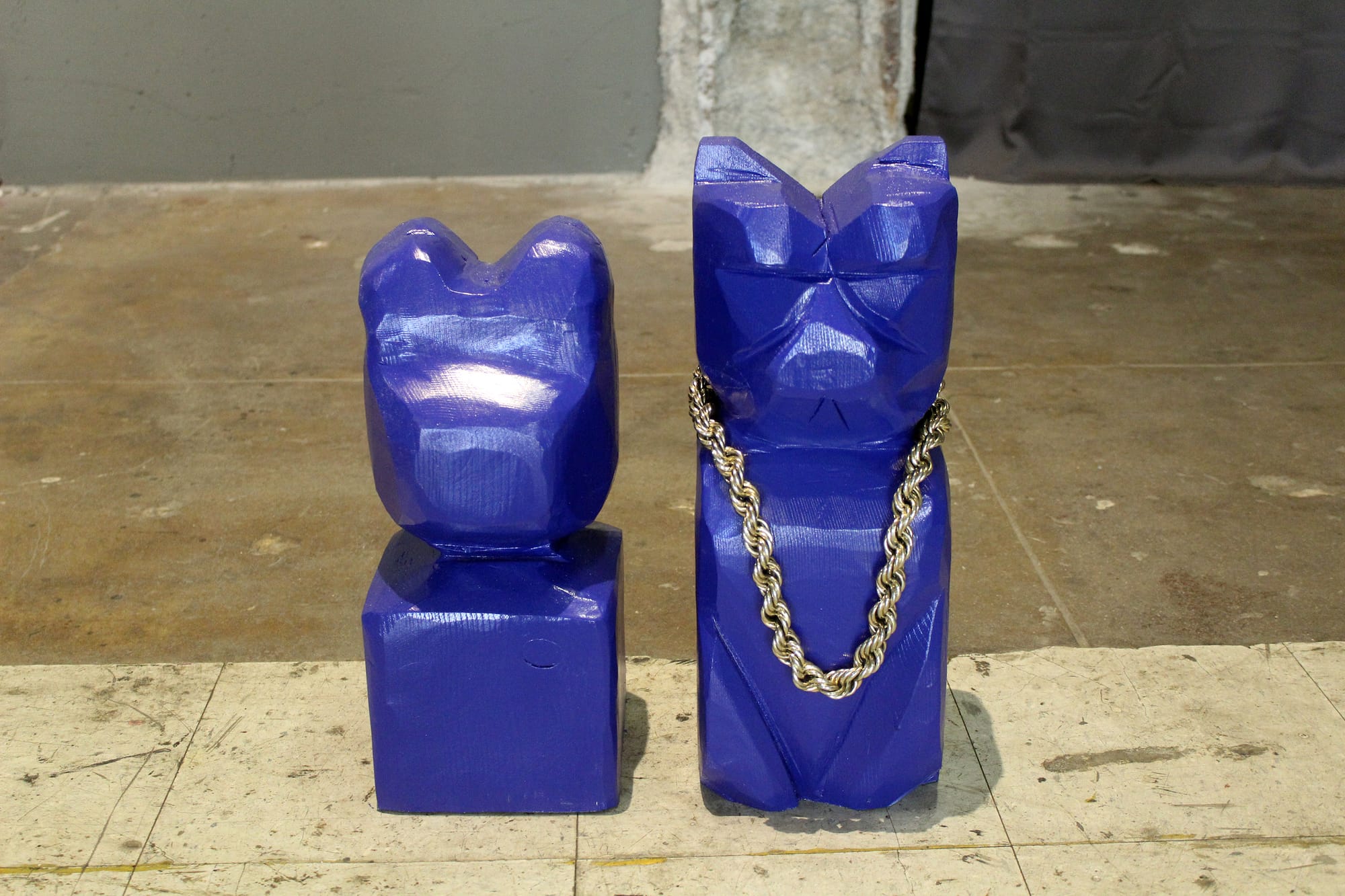 Despite the multilayered reference points, PER CAPITA always points back to Los Angeles. Rashid uses materials common to city life, like in “I Found the A” (2018), in which a prism is constructed from broken windshields and spray painted black so it shines like marble. In “Nancy Boi” (2020), Rashid has carved Anansi the trickster, the West African God known for changing into a spider to outwit his enemies, into a large slab of walnut, a tree native to Southern California. A small Dodger blue sculpture, “Yves Klein Garden Collection: Paws for the Kaws” (2021), portrays a guardian who protects the home, sporting a thick gold chain. In Rashid’s universe, old world spirituality has new world swagger.
