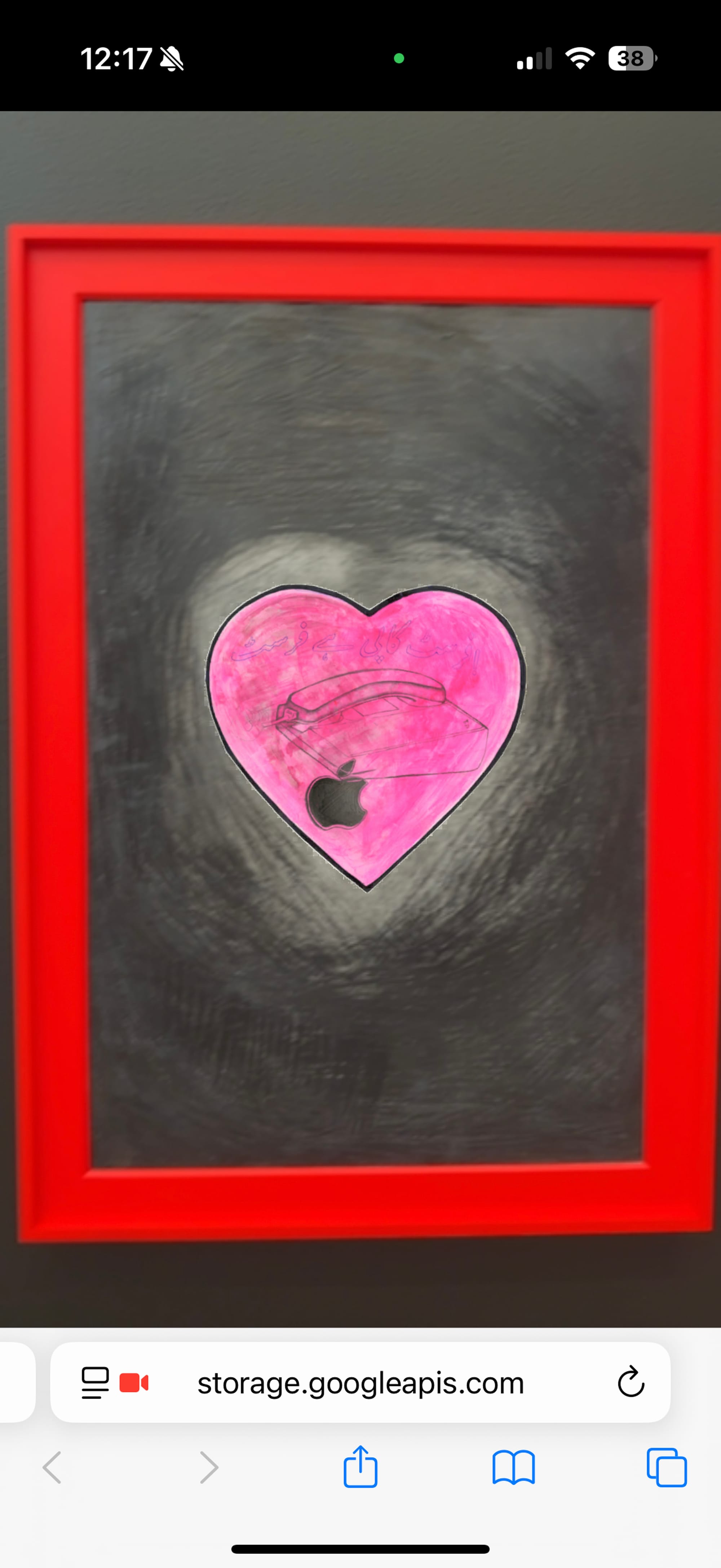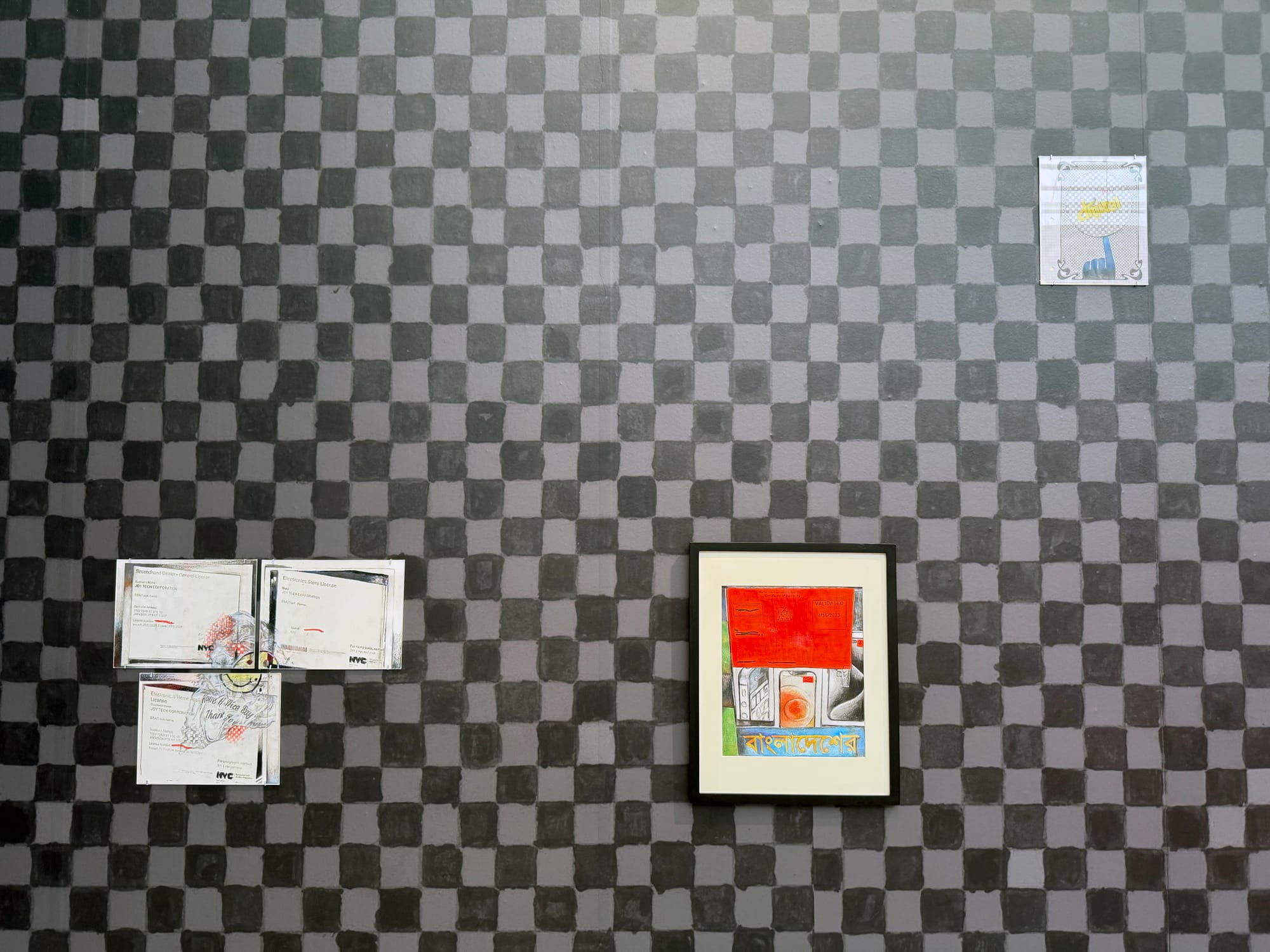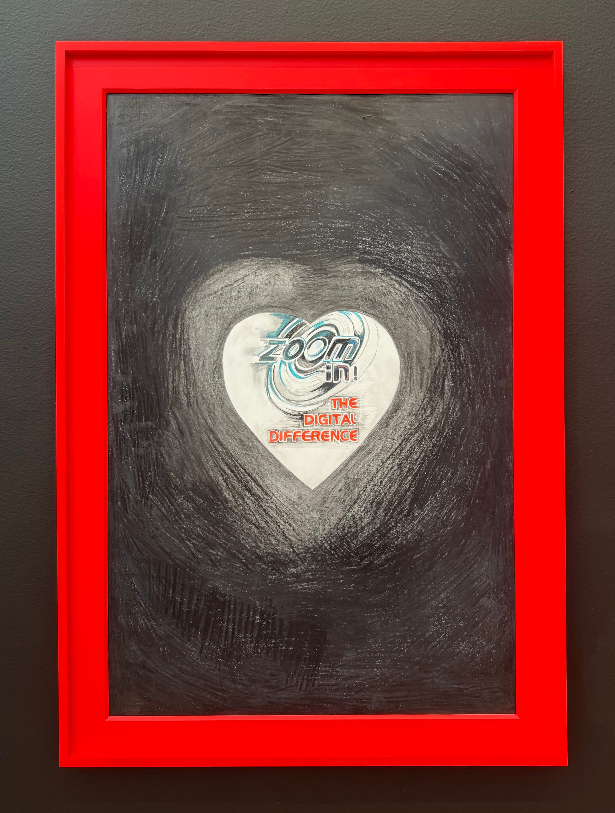 Multiple works in the exhibition contain AR elements, two of which are displayed across from “Untitled.” The drawing “zoom in” (2024) consists of the titular words along with the phrase “THE DIGITAL DIFFERENCE” embedded in the center of a heart, surrounded and engulfed by lines of motion that recall Y2K Futurism. The words take on a double meaning: On the one hand, “zoom” denotes speed and excitement, in line with a tourist agency promising adventure; on the other, it suggests digitally zooming in on something, which emphasizes the distinctly handmade quality of the work. Follow a set of instructions on the wall label and point your phone toward the drawing, though, and the heart beats with serial animations that includes logos, arrows, and a map that references the 1947 partitioning of India, and what would become Pakistan and Bangladesh.