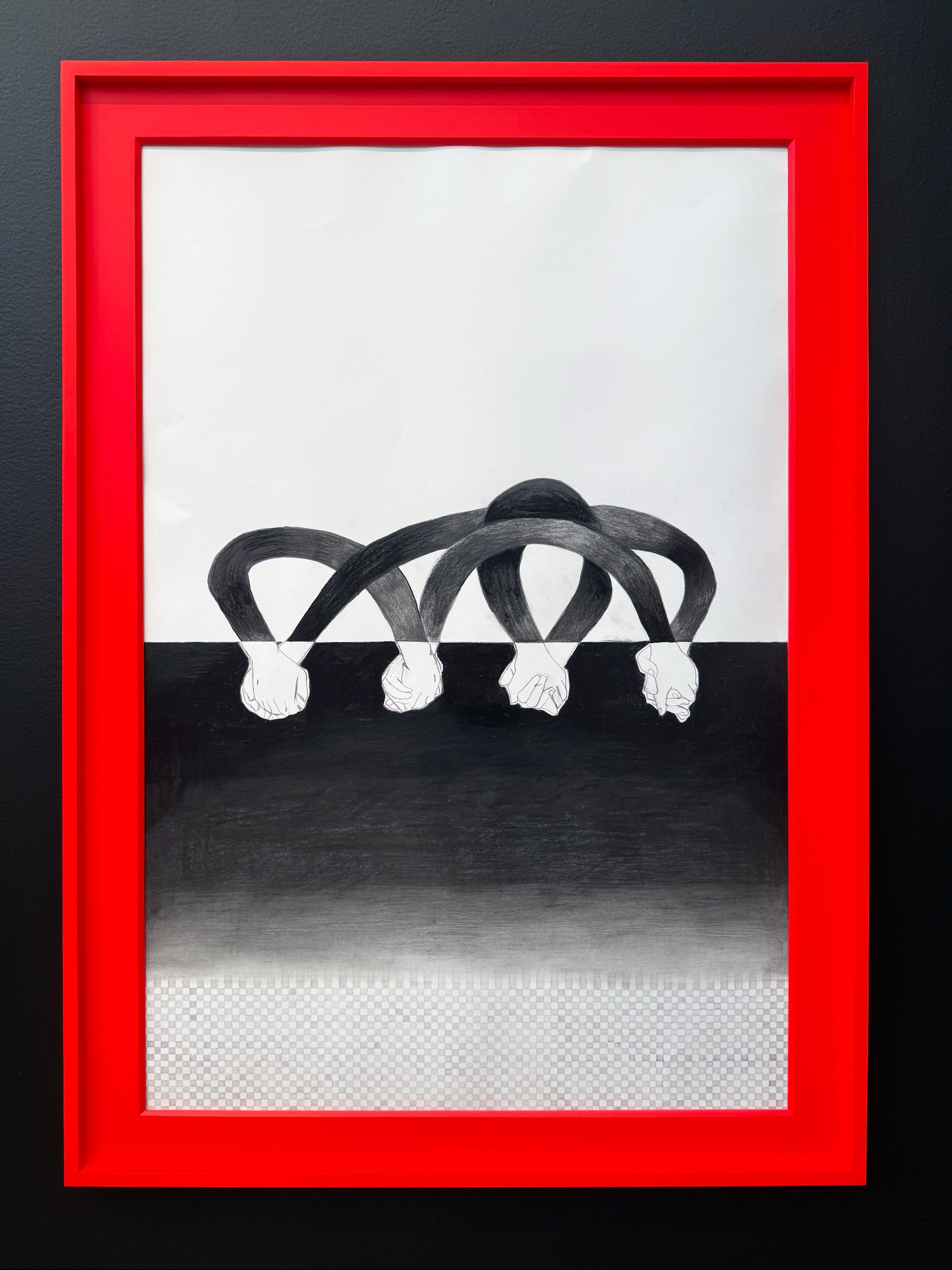 I also wondered if someone who was less familiar with the visual culture of Queens and invested in the related Chinese/Chinese diasporic aesthetic of Shanzhai may have a differing opinion of “WE CAN FIX IT.” And I considered whether a related bias in background (such as my own failed forays in the medium) might shape my feelings about her drawings. Some, such as the AR-activated “Saath Haath” (2024), depicting hands clasped together beneath a horizon line as dark bands connect them above, felt a little juvenile to me in their technical clumsiness, whether intentional or not. But they do make for a great contrast with the slickness of the exhibition’s digital innovation, as well as mesh well with the stuttering visual culture of an early internet, which is endearing and nostalgic.