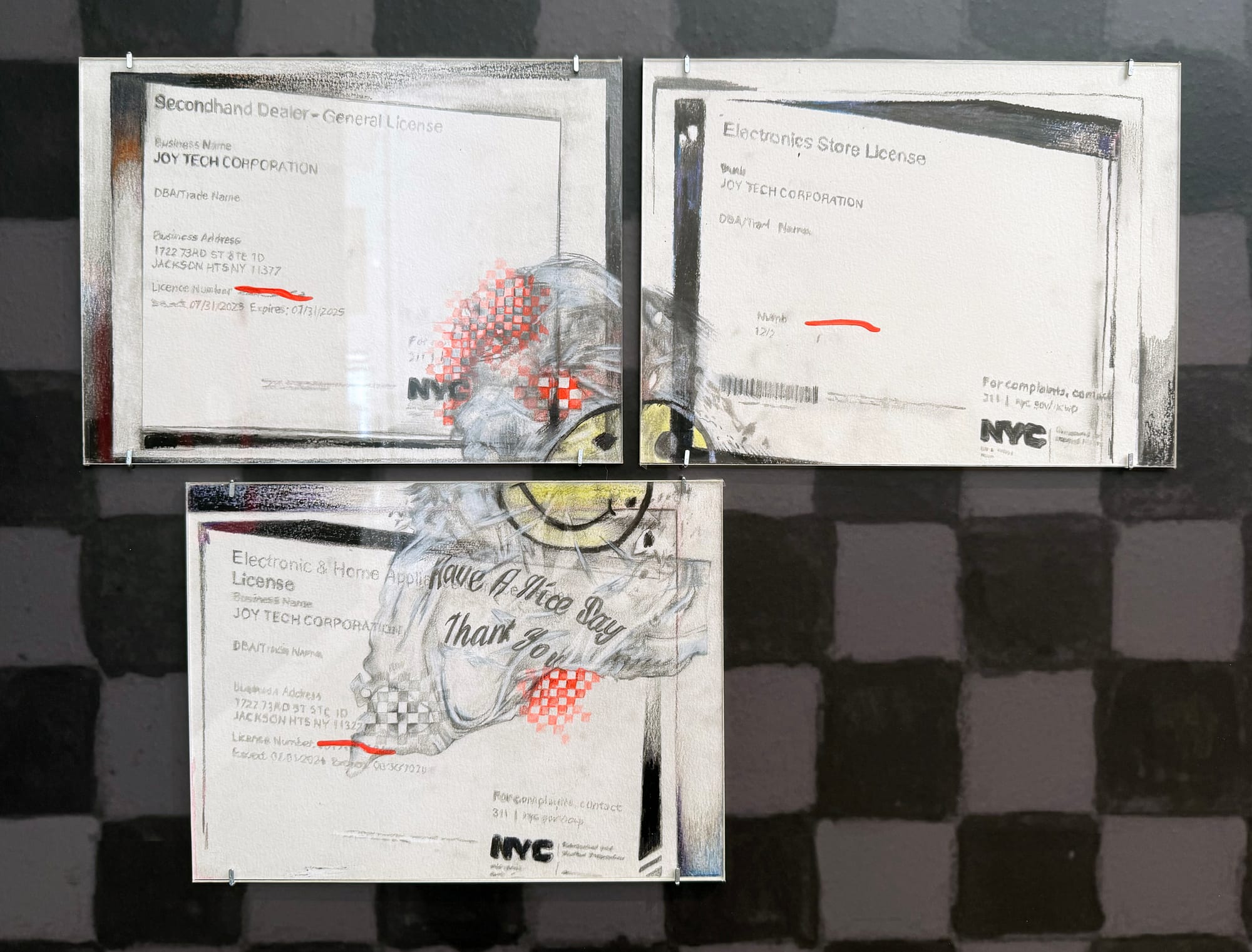 Majeed’s work also spurred perhaps the deepest and most substantive episode so far in my ongoing struggles with my perception of “good” and “bad” aesthetics, and whether they come from an internalization of problematic hierarchies. I loved “WE CAN FIX IT” (2025), a wonky signboard made of decals on ceramic and wood that bears the title along with faded photos of defunct devices. It felt like a smarter, sharper, and more politically agitative version of the work of Shanzhai Lyric. Rather than simply arguing for the beauty of pedestrian culture, as Shanzhai Lyric does with misspelled English words in Chinese clothing and Majeed does with diasporic South Asian-owned tech repair shops, the work also points toward the potential of these visual languages to unsettle dominant forms. To me, they represent the trickle-up of hyperlocal rather than the trickle-down of corporate culture, the evidence of life carved out from inhospitable terrain. But I also wondered if I responded to the work because I could easily imagine it in a white cube gallery.