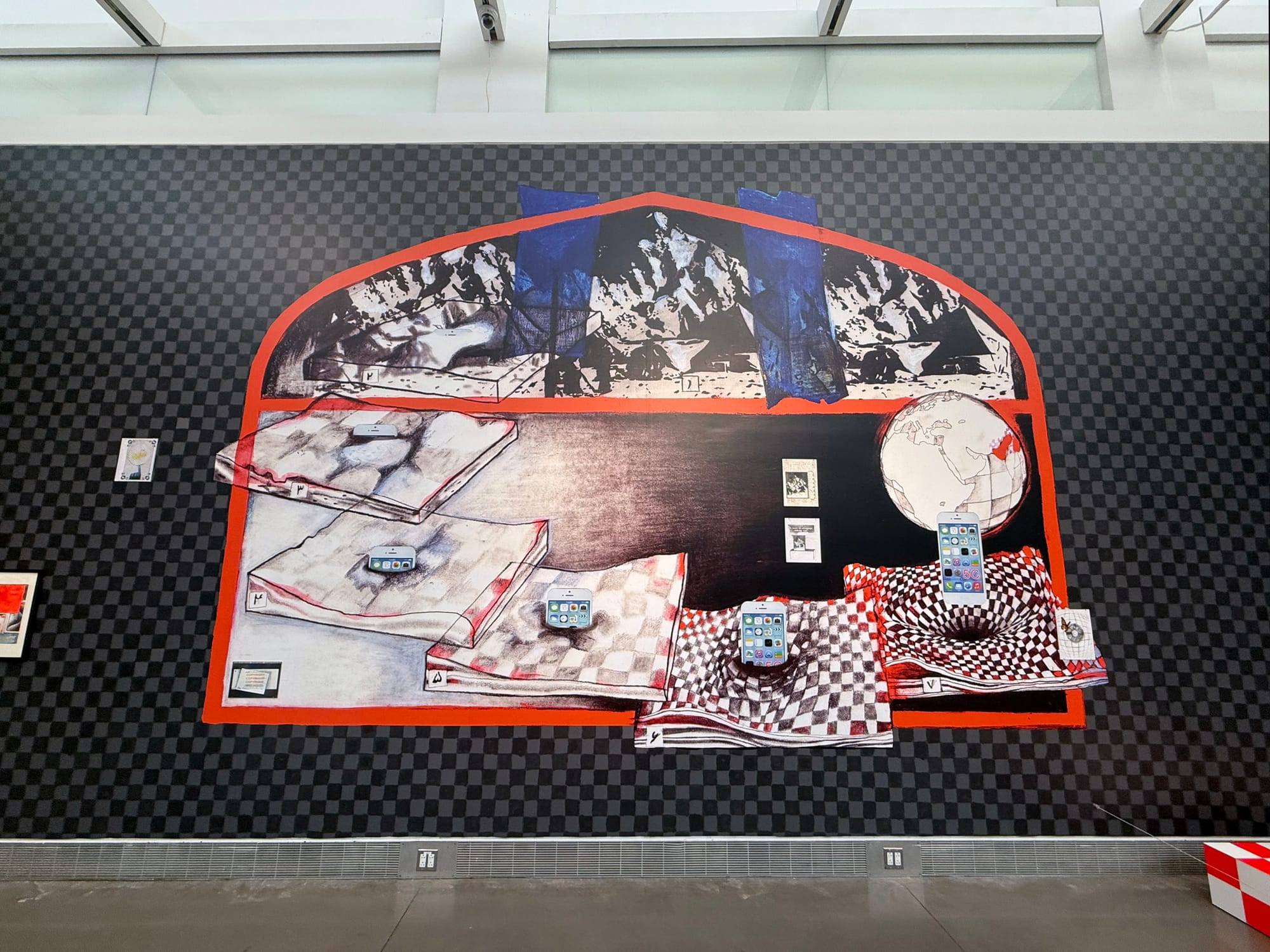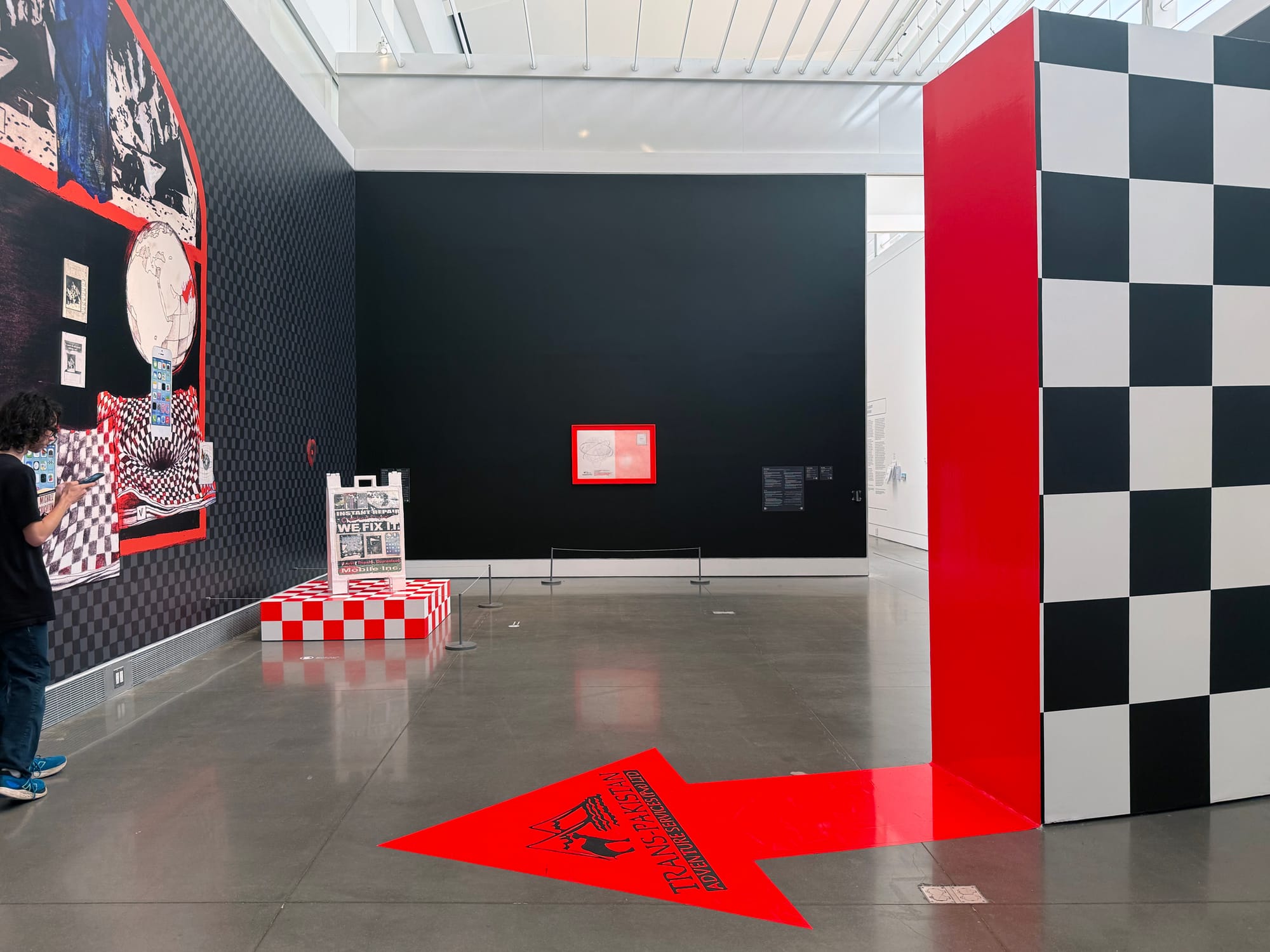J😊Y TECH toys with and occasionally explodes the typical form and boundaries of an exhibition. The bold neon-red frames of the AR works color more analog elements as well, including a dynamic arrow that zig-zags from the ceiling onto the top of the partial wall that divides the exhibition diagonally and down its side, ending on the floor pointing toward the massive vinyl wall work “Timeline” (2024–25). A black and white, red and white, or gray and white grid alternatively invoking the tiled flooring of a small business and a blank digital space (such as in a new Photoshop document) is a key motif of the exhibition — it appears on multiple walls and is reproduced in smaller, more playful form within individual works, such as a vortex sucking in an older-generation iPhone. The motif is intended to bend and fuse the planes of real and digital space just as she digitally builds on her uncle’s real-life travel agency.