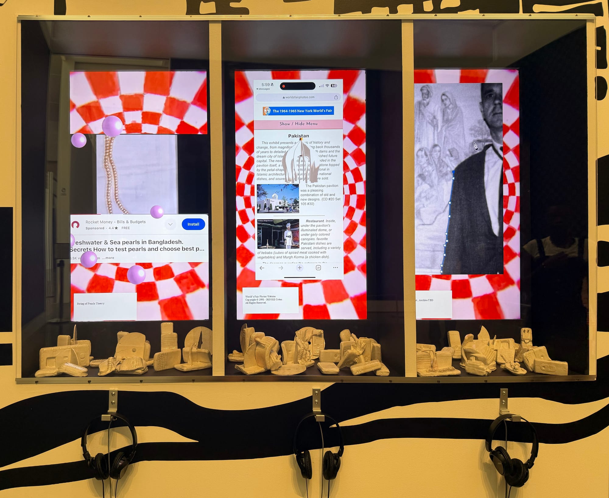 An untitled video work near the end of the exhibition feels most difficult to grasp. It mimics the visual-sonic-informational overload of social media — there’s image-editing, ads, webpages, archival information, iPhone screen recordings, and icons bouncing about the three channels, not to mention a collection of real-life ceramic sculptures. It effectively satirizes the kind of quick-cut brainrot endemic to Youtube essays and TikToks, but to what end? I walked away with a lot of interesting information buzzing around my head — jewelry designer Barbara Anton was commissioned to highlight the natural pink pearl farming industry in what is now Bangladesh as part of the World Fair, and “String of Pearls” is also a term invented by the United States to refer to a network of Chinese military and commercial facilities, for instance — but not the architecture to put it together.