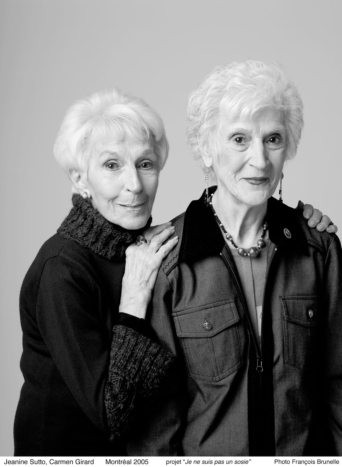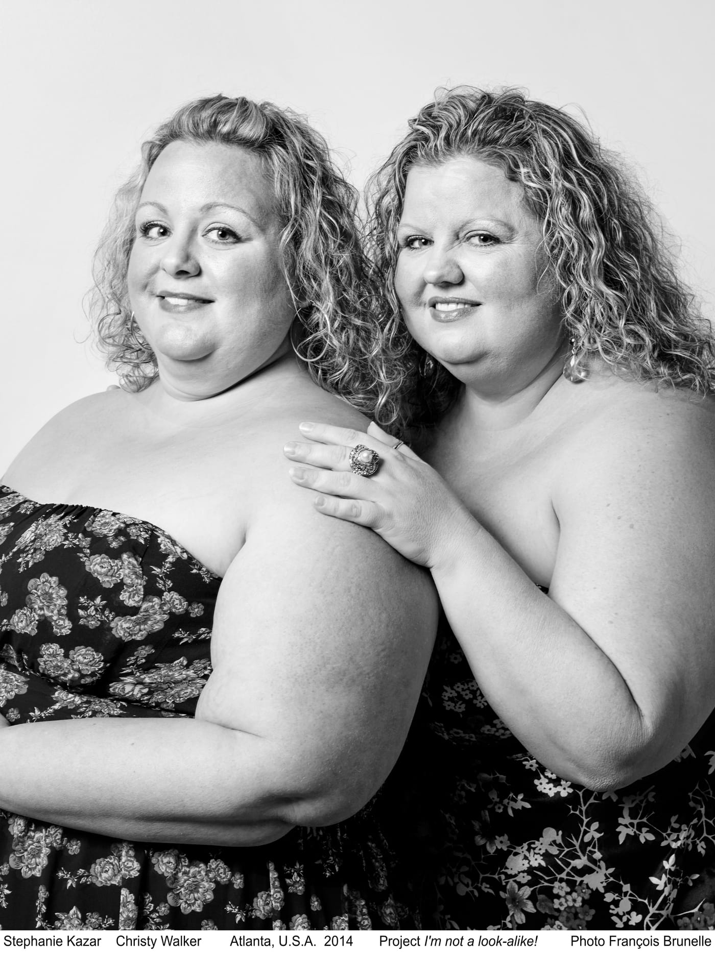 Some of Brunelle’s subjects are longtime friends or acquaintances, while others meet for the very first time at the photo session. For most images, subjects pose in their own clothing, with their own hairstyle and no special make-up, and though they don’t always look identical, Brunelle’s subjects do seem consistently at peace with themselves and the person who stands by their side, often with arms around each other.