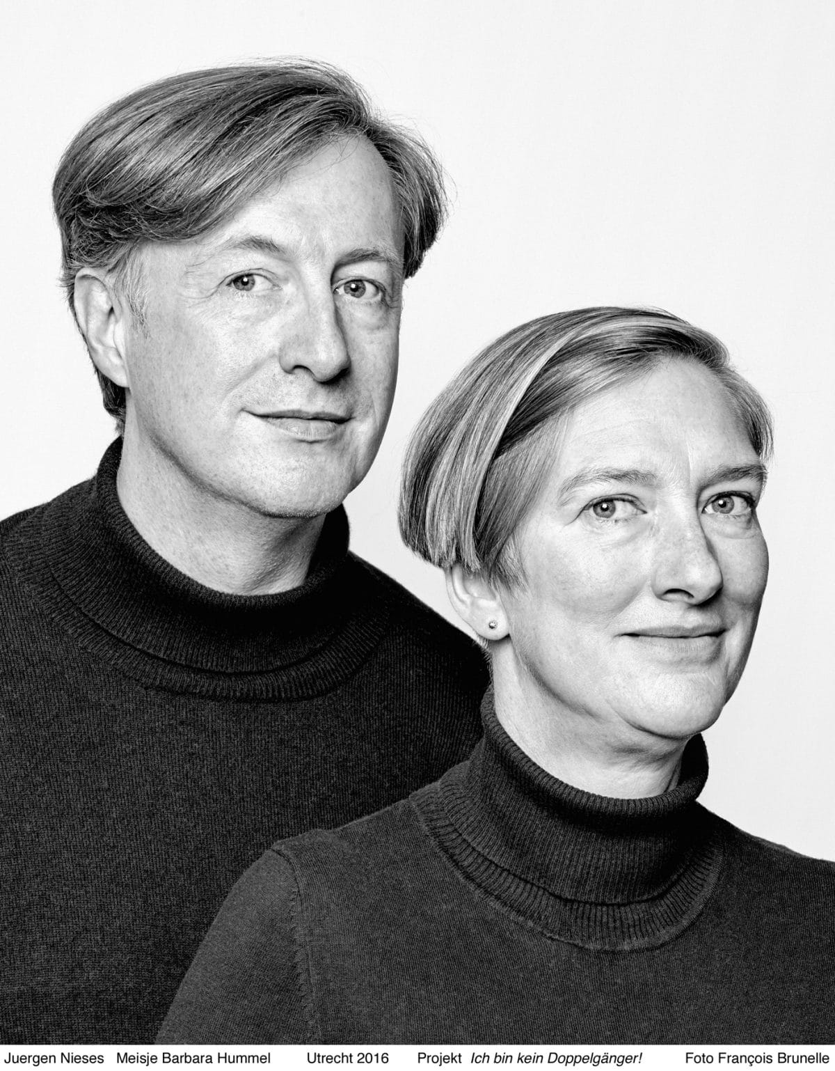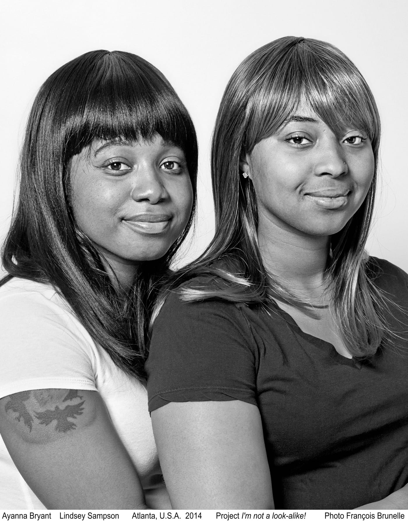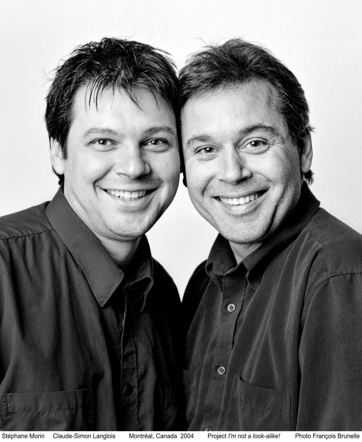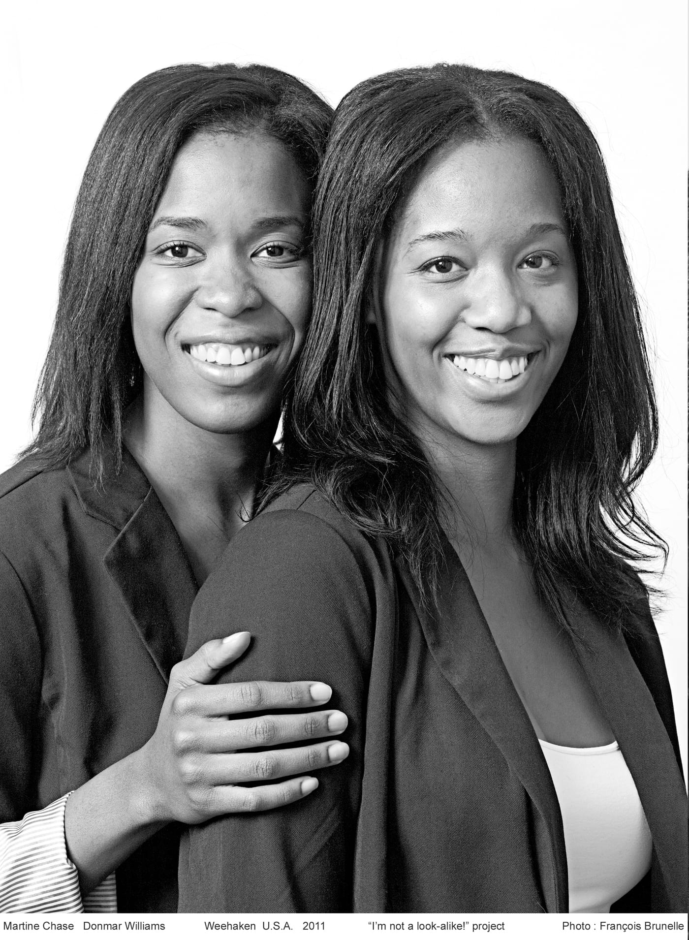 Brunelle notes that not all the subjects are entirely similar, but finds the differences as interesting as the points of commonality. He chooses to make the portraits in black and white, so as not to complicate matters of similarity by variations in skin color, bringing focus to the facial features.