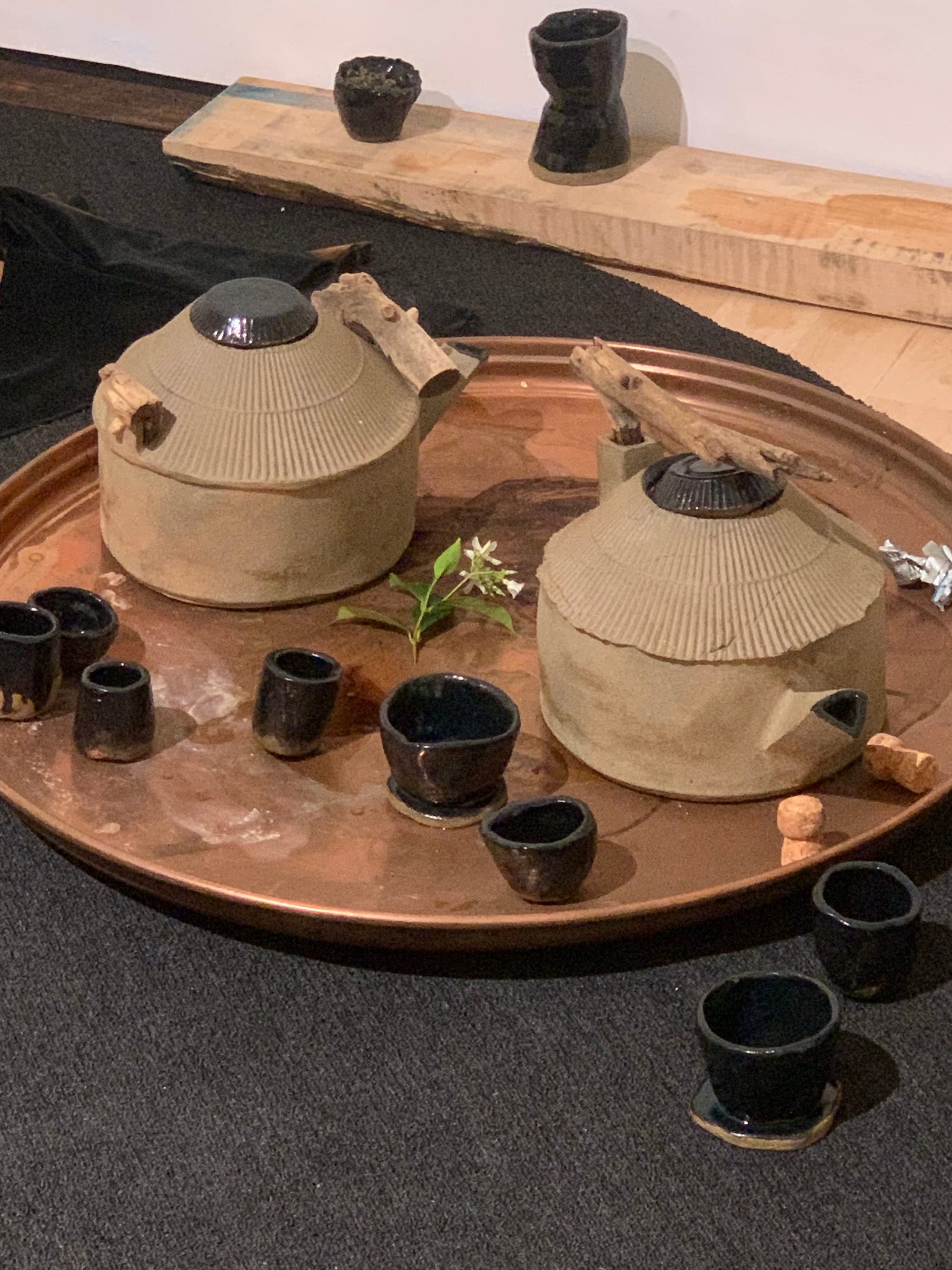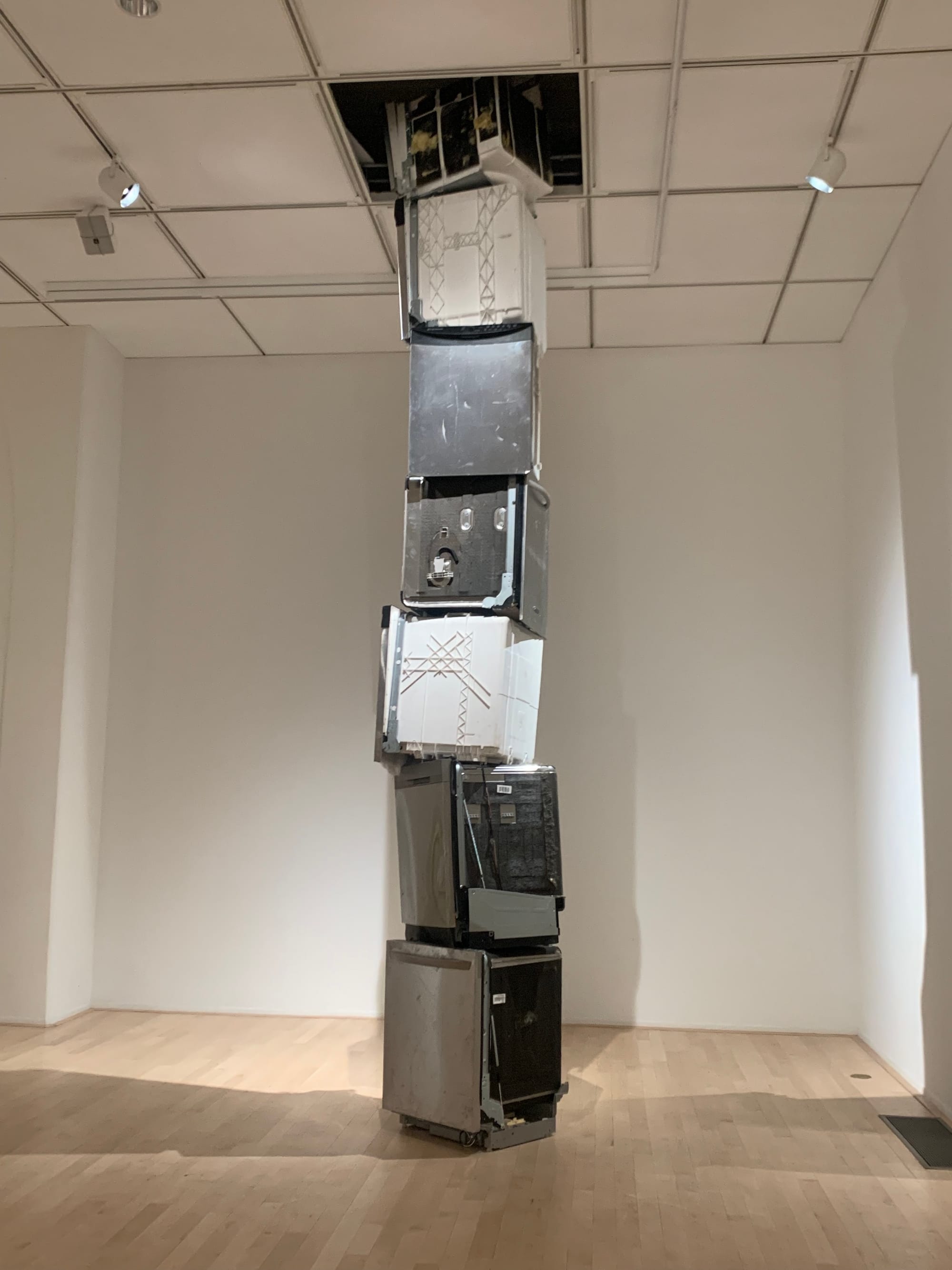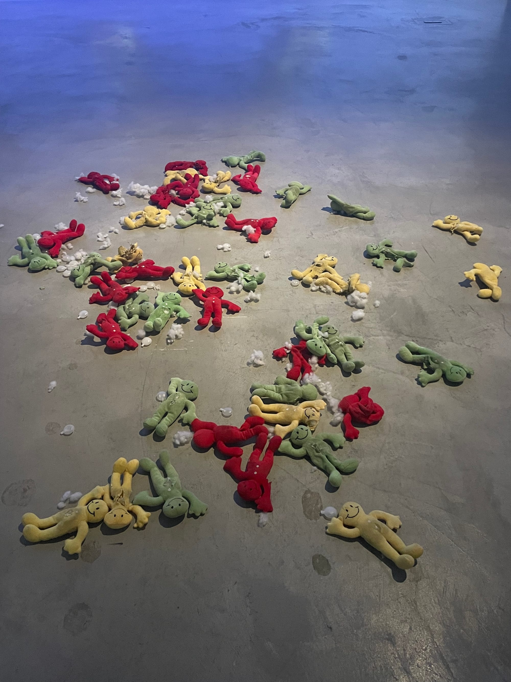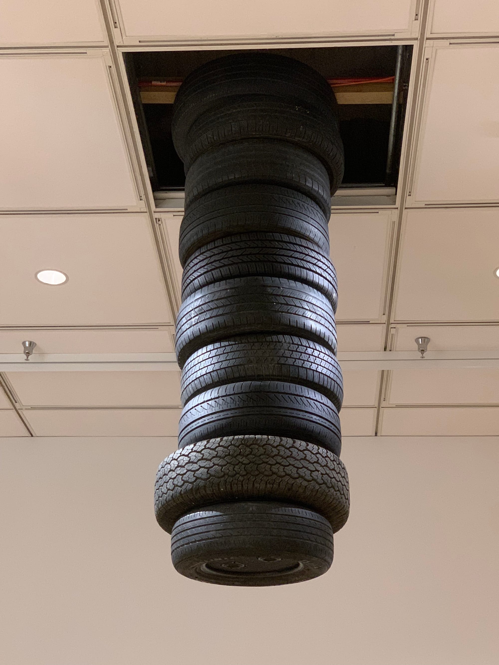 The interdisciplinary mode of thinking at the program reflects the faculty, as current professors in the program include Ulysses Jenkins, Daniel Joseph Martinez, Monica Majoli, and Amanda Ross-Ho, artists all known for their fluid use of media. Ross-Ho, full of renewed energy as the school transitioned back to campus full time, introduced me to her senior students Tarik Garrett and Katherine Aungier. The pair of students collaborated during their time at UCI, culminating with a combined thesis presentation titled “The Ringer Irreconcilable” which shared similar themes of site-specificity. Aungier spent time researching UCI’s on-campus yurt, known simply as The Yurt. A theatrical landmark of sorts on campus, the yurt was first built in the early 1990s when UCI Drama professor and theater director Jerzy Grotowski requested the dwelling be built as a gathering place and resource for his theater students. During Grotowski’s time, the space was used by students to develop work and became known as a space where late-night courses and experimental exploration were championed. For Aungier, the dwelling served as the setting of a video work: a methodically shot meditation on the domed skylight of the space, exploring its importance to the physical location of UCI’s campus and the way it has affected students who spend time in the school’s many art departments. The video was exhibited alongside a tea set and the sun-stained curtains from the yurt, seeming to speak to the imprint left on the space by both time and its many inhabitants. Garrett, meanwhile, presented a series of found-object monuments, such as towers of mini-refrigerators, or else car tires either emerging from the galleries or stacked into heights almost reaching the ceilings, thus revealing the internal architecture of the space. Shown together with wall works featuring distressed labels from glass bottles of beer like Modelo and Budweiser, Garrett’s works highlight a kind of leftover material, perhaps from his time on campus at UCI. The viewer is left to wonder if Garrett’s sculptures of tires also constitute the leftover material of time.