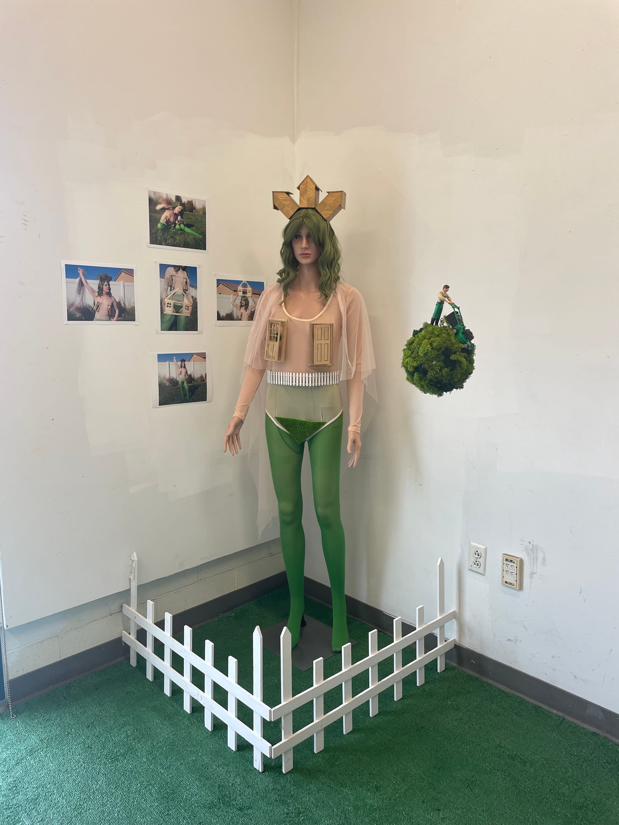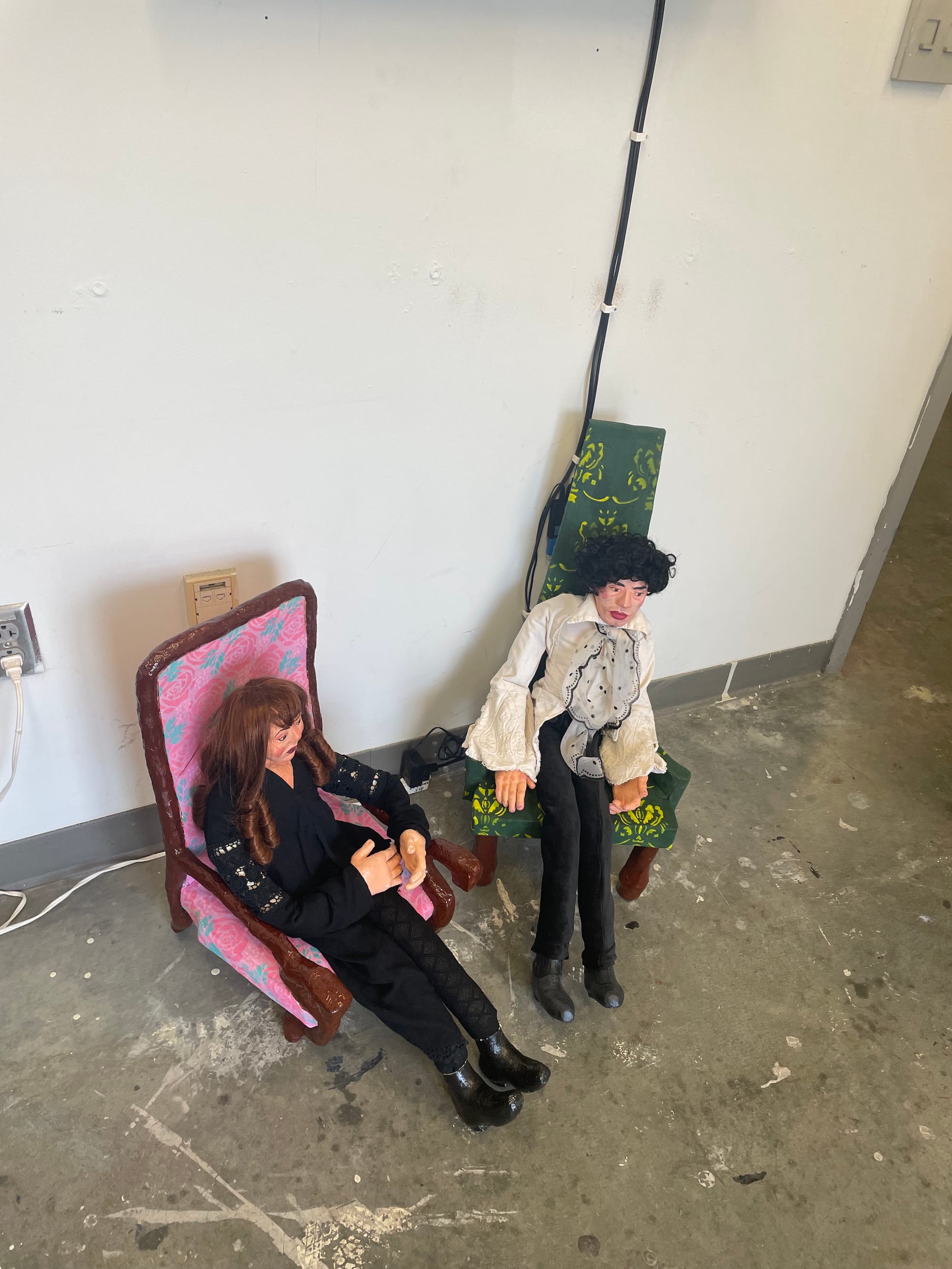 When I spoke to second-year MFA student Emily Babette, she mentioned she would be using her time in the space to workshop elements of a video and performance piece for her thesis project. She spent the year preparing a full-length film, with many elements of the future work on view in her studio, including two puppets Darwin and Emily (a realistic-looking replica of the artist) that will act as star performers, large format paper cutouts that will act as sets, and a handmade costume that the artist will wear when she makes an appearance in the eventual video work. Babette plans for the film — a comedy horror — to explore elements of the human psyche, using the Emily puppet as a proxy. Originally a painter by trade, Babette has devoted her time at UCI to learning and solidifying new mediums, including expanding beyond art to incorporate writing, psychology, and philosophy into her studio practice.