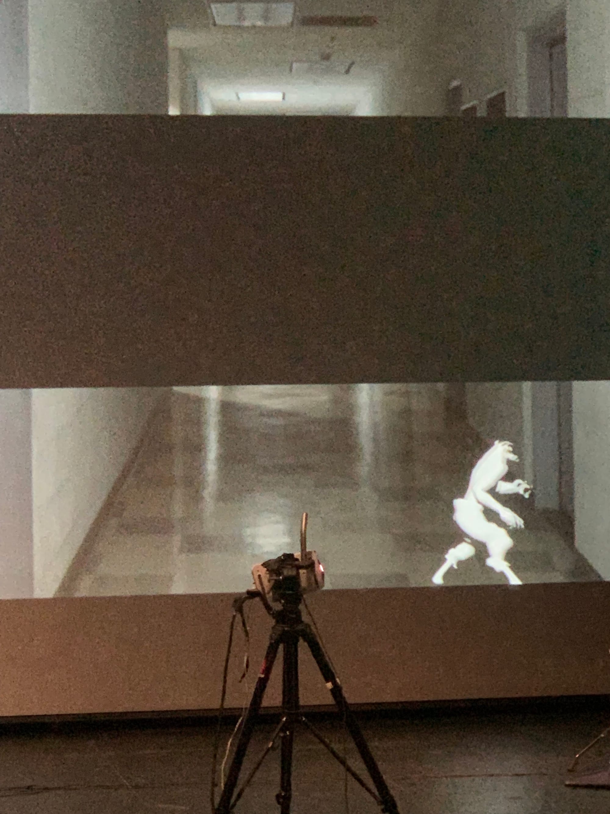 Ross-Ho encouraged me to check out the xMPL before I headed back up to LA. There, I encountered the work of Zach Benson and Brain Bowman, who also presented a combined thesis project titled “Hall Minotaur” — an immersive multimedia work comprising sculpture, video, animation, and coding, which explores institutional hallways as labyrinths. Utilizing custom coding in computer software Max MSP, the duo mapped the resonance of specific halls on UCI’s campus. Due to their use of reverberated audio and multiple screens, the piece created a disorienting effect — a sensation further heightened by the presence of a camera tracking the movement of attendees, playing its footage back into the space. In addition, Benson sculpted a replica of the university’s hallway, adding to the elaborate construction and the complicated feedback loop of the piece. Although individual elements from Benson and Bowman were clearly present, the entire piece blurred the lines between both artists’ practices, functioning as a catalyst for a much larger path for the two to explore their relationship as collaborators.