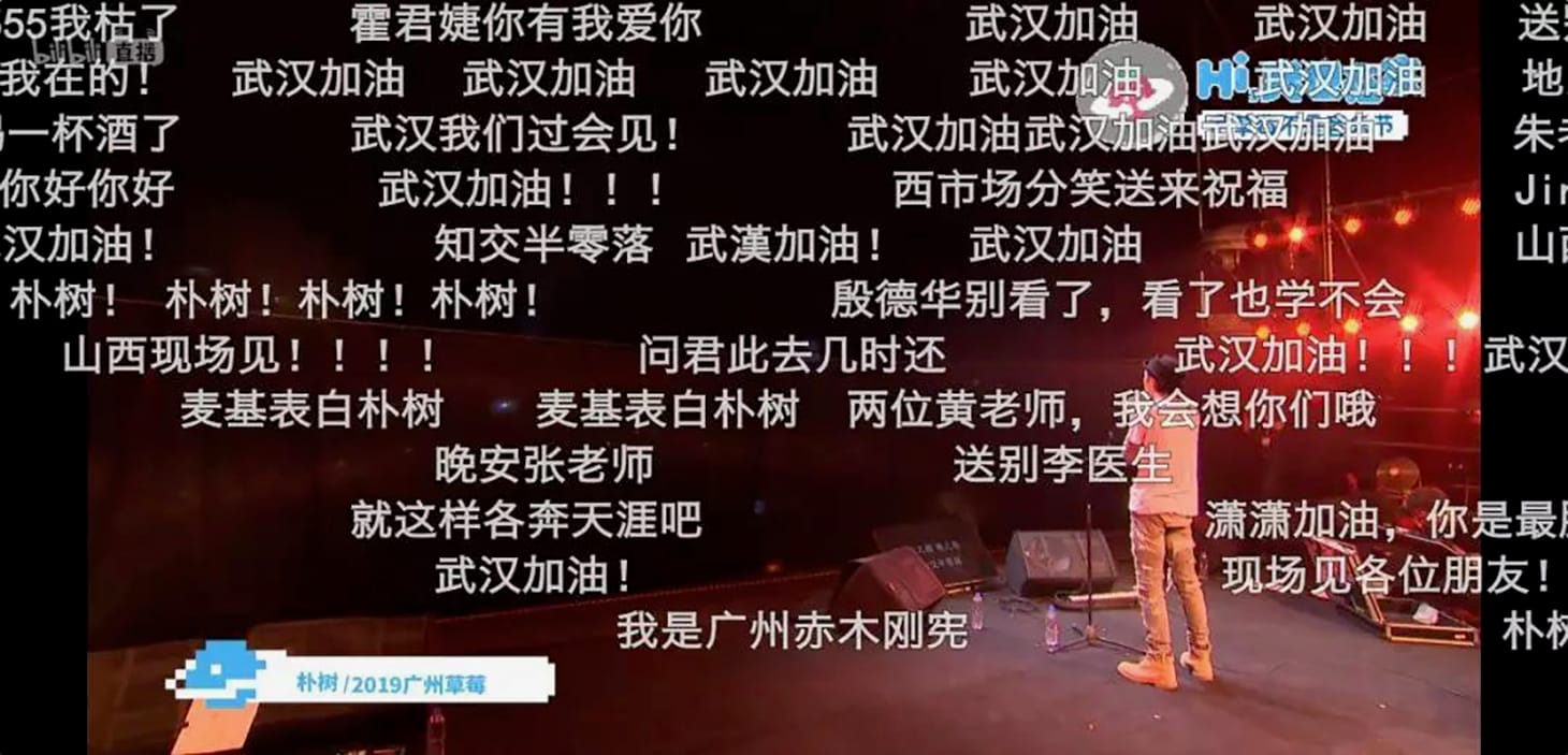 Prominent indie record labels like Ruby Eyes and Modern Sky are streaming “showcases” for artists on their roster, and venues like Shanghai’s Yuyintang are even considering ticketed online performances. Many of these are hosted on the live-streaming site BiliBili, which contains a crucial social feature, Bullet Comments or 弹幕 (“danmu”), that make these events an active expression of community and social bonding, rather than just passive experiences. Bullet Comments are a mix of discussion forum threads, live chat, and participatory art that conjure a powerful online approximation of real-life conviviality, and a raucous vibe akin to a successful party. Comments made on a video fly across the video screen like heckles or encouragement from a virtual audience.