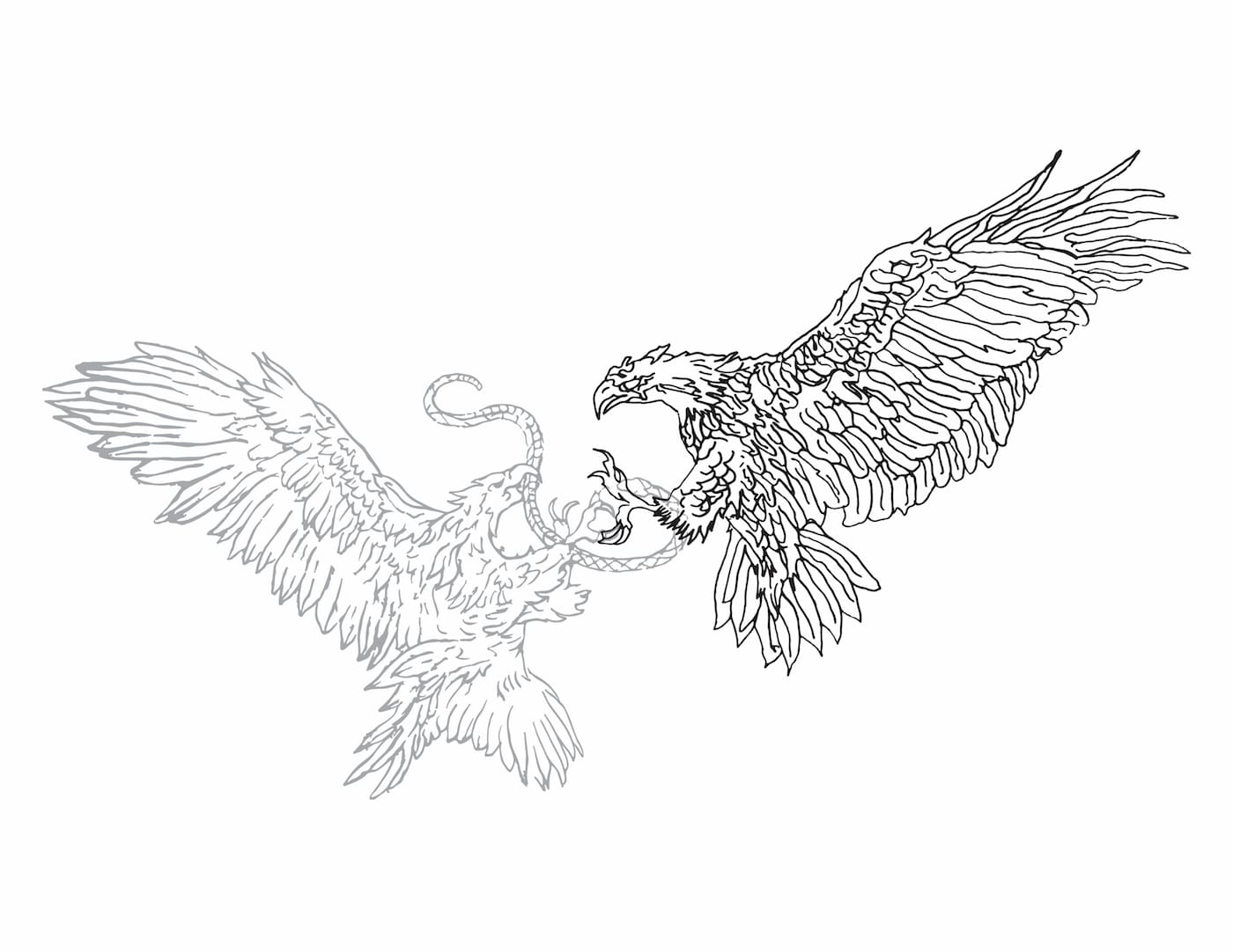 The historic usage of the eagle as nationalistic and patriotic symbols are used to evoke power, aggression, invulnerability and triumph. In this case, two eagles caught dueling in mid-flight speak to the tangled love and hate relationship between the neighboring countries.