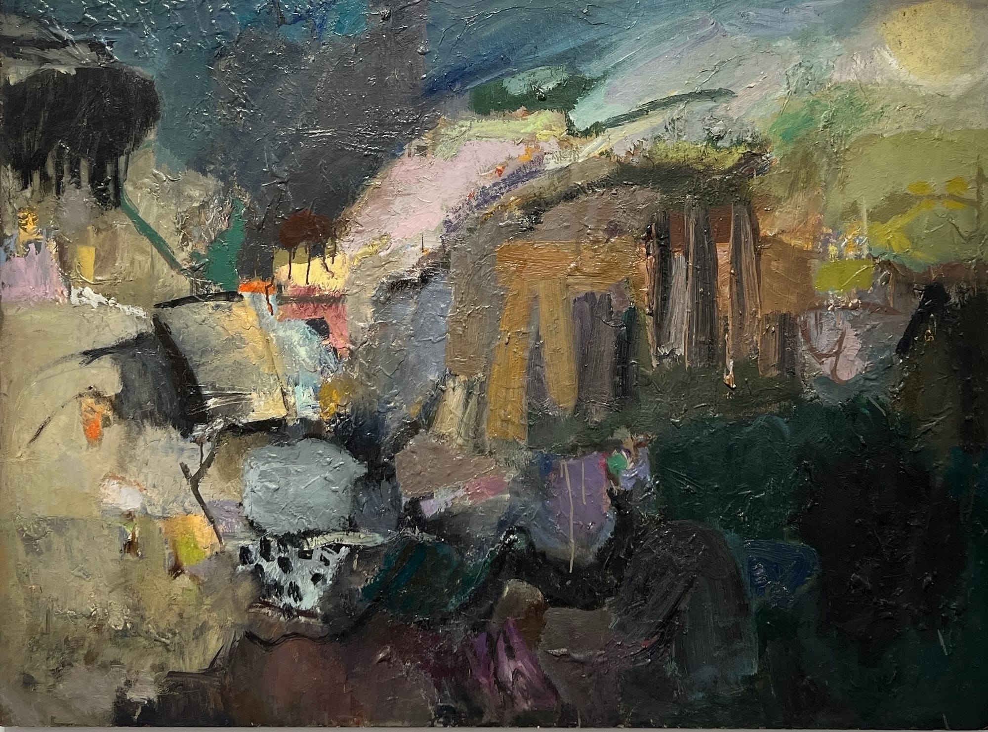 Nell Sinton (1910–1997), whose art evolved from family scenes and cityscapes to abstractions, is represented by a 1958 oil titled “Dark Landscape.” Characterized by critic Bill Berkson as a “sensibility painter,” meaning that “her feelings about a specific motif are peculiar to the way she shows what she sees of it,” Sinton’s work has not been shown in depth since a 1981 retrospective at Mills College. If “Dark Landscape” is any indication, she was a skilled and interesting colorist and capable of compelling painterly improvisation.