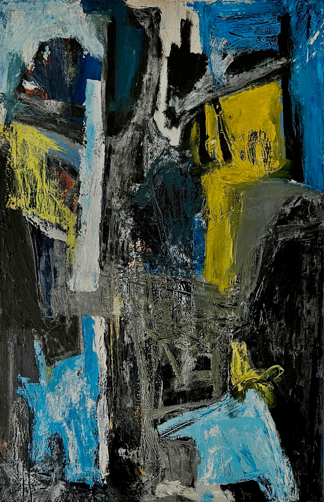 Wyoming-born Ruth Wall (1917–2009) served as a pilot during World War II and then studied at the California School of Fine Arts with Hassel Smith, Edward Corbett, and David Park. Also a printmaker who exhibited a suite of abstract lithographs at the CSFA in 1952, she later lived and exhibited in Paris before returning to San Francisco. Her 1957 “Untitled” oil has a ragged, blocky sense of irregularity that bears comparison to Philip Guston’s works from the same era.