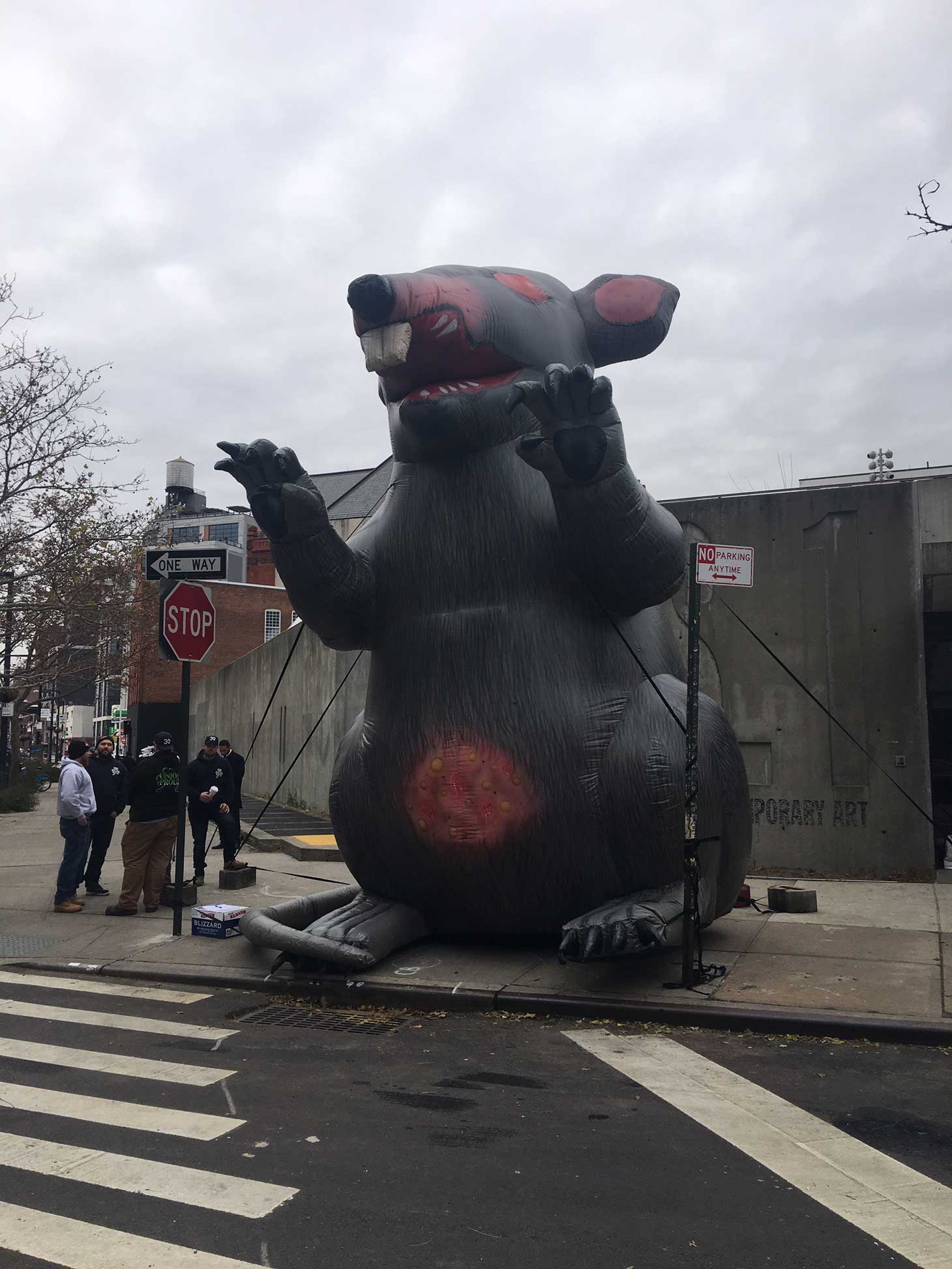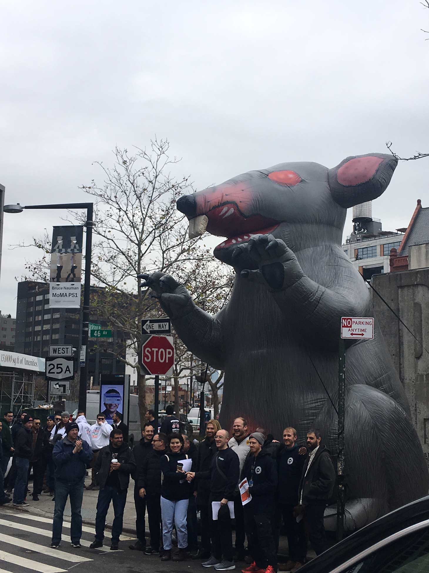 On a blustery Sunday just before noon, the first visitors to MoMA PS1 in Long Island City were greeted by a giant, grey inflatable rat with sinister pink eyes. Men and women in blue sweatshirts emblazoned with “Local 30” in white letters, fanned out across Jackson Avenue, handing out fliers that said, in part, “The MoMA PS1 art installers and building maintenance crew are fighting for a fair contract that protects and improves their jobs at the museum.”