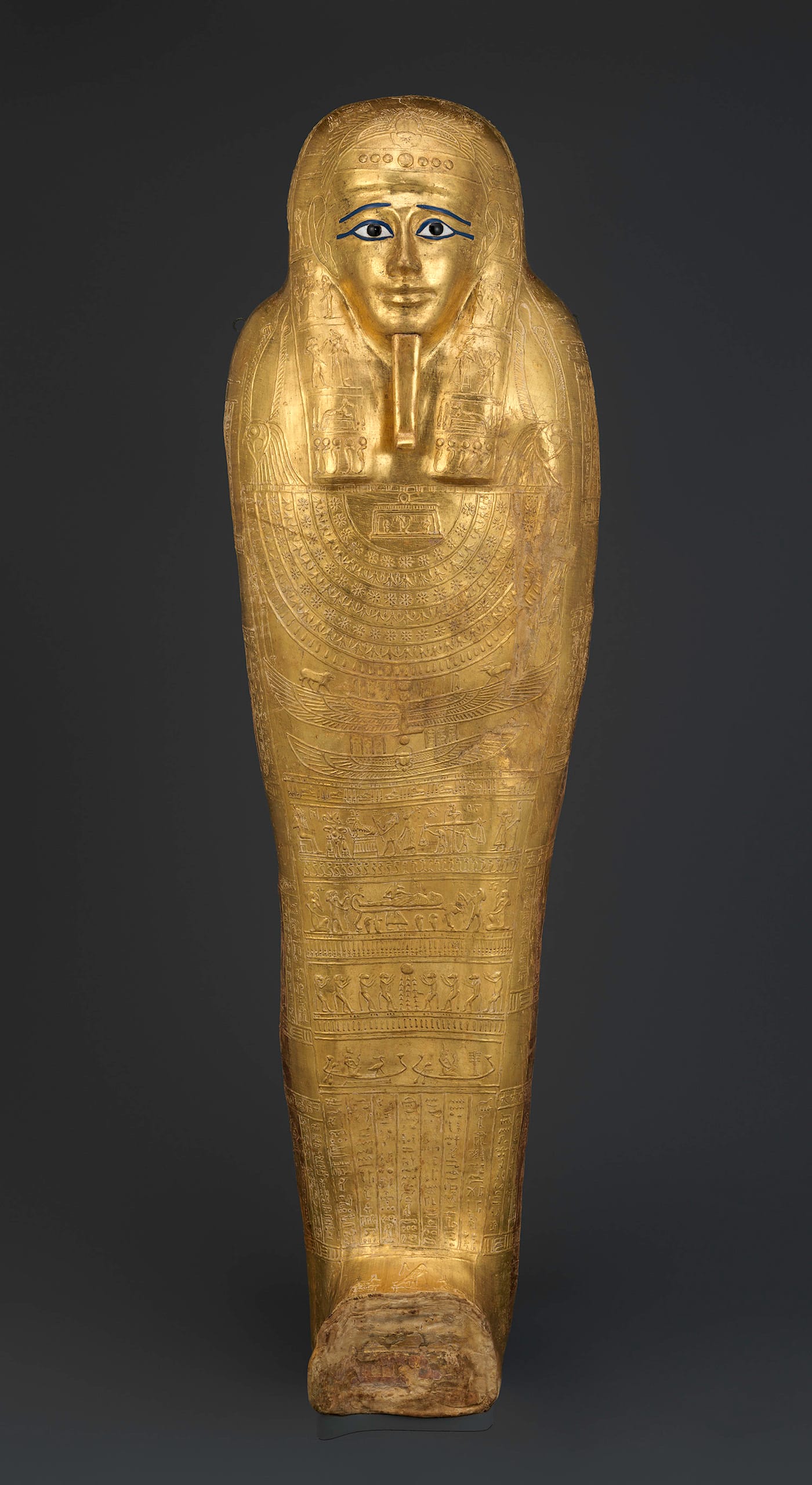 Dating to the late Ptolemaic period, the mummiform coffin was inscribed for the high-ranking priest Nedjemankh, who was part of the cult of the ram-god Heryshef of Herakleopolis. Its gold-sheathed surface portrays scenes and texts in thick gesso relief that served to protect the deceased as he ventured into the afterlife. Its interior, too, is decorated, featuring a unique detail: thin sheets of silver foil intended to protect the priest’s face.