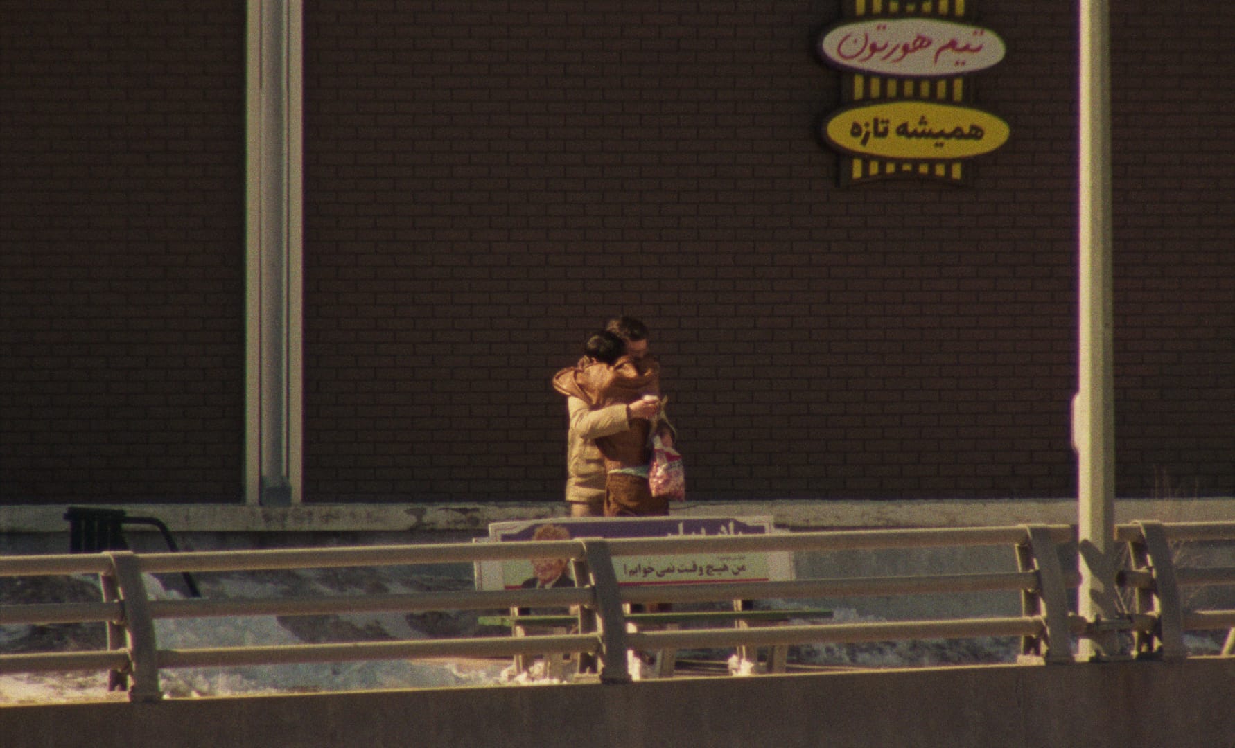 In Universal Language, director Matthew Rankin transforms the environs of his native Winnipeg into a tight-knit Iranian hamlet. Advertisements and street signs appear in Persian script, and Farsi is the primary language spoken (although the government of Québec, nearby in the topsy-turvy geography of the film, still sternly insists on French). Townsfolk hawk wares from makeshift stalls set against Brutalist municipal blocks. Flocks of wild turkeys wander snowy streets. In one truly resplendent moment, glazed donuts mingle with brass samovars and beaded tablecloths at a candlelit Tim Horton’s (a doughnut chain started in Canada), tended to by a politely arch proprietress who seems straight out of Iranian director Abbas Kiarostami’s beloved 1999 film The Wind Will Carry Us.