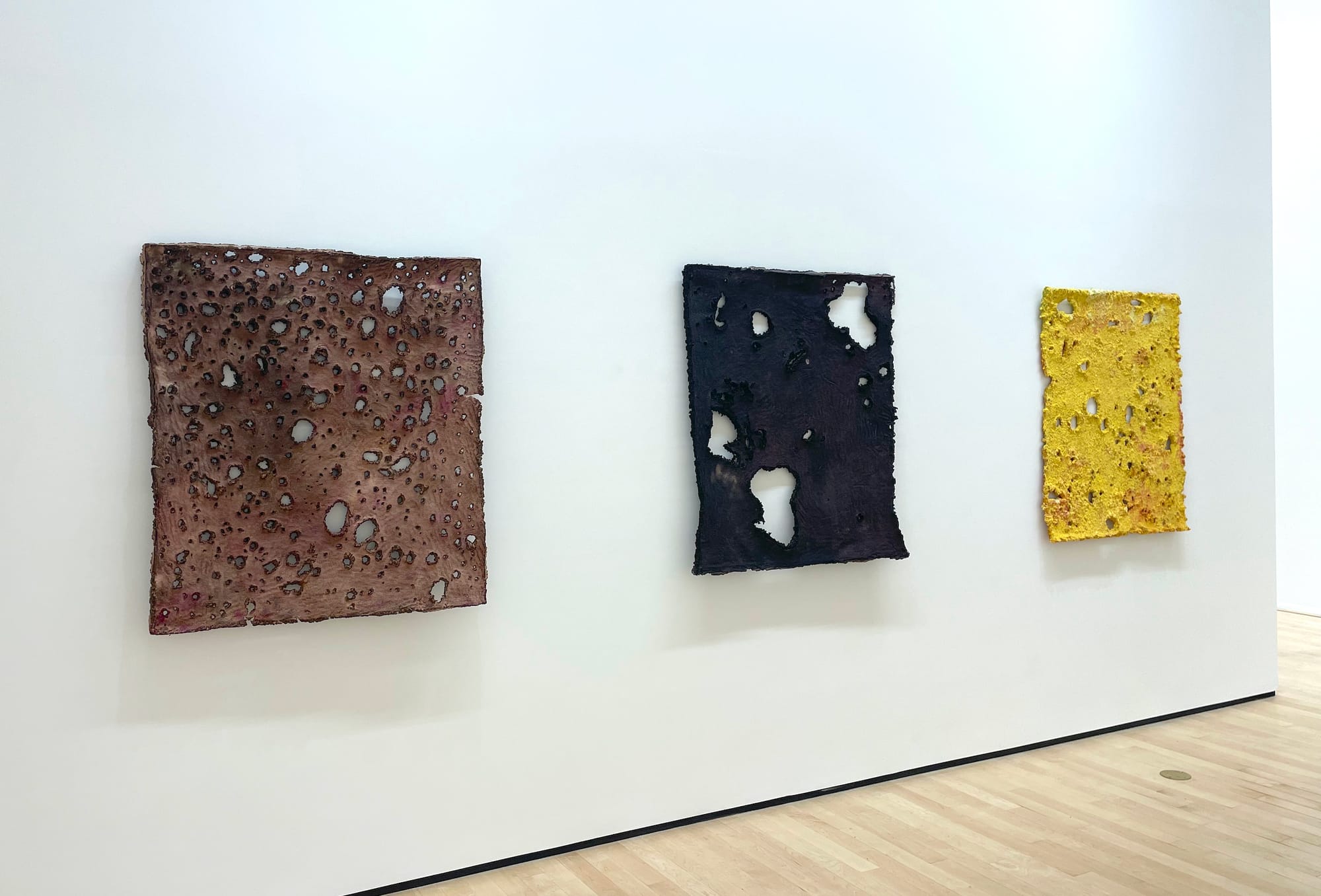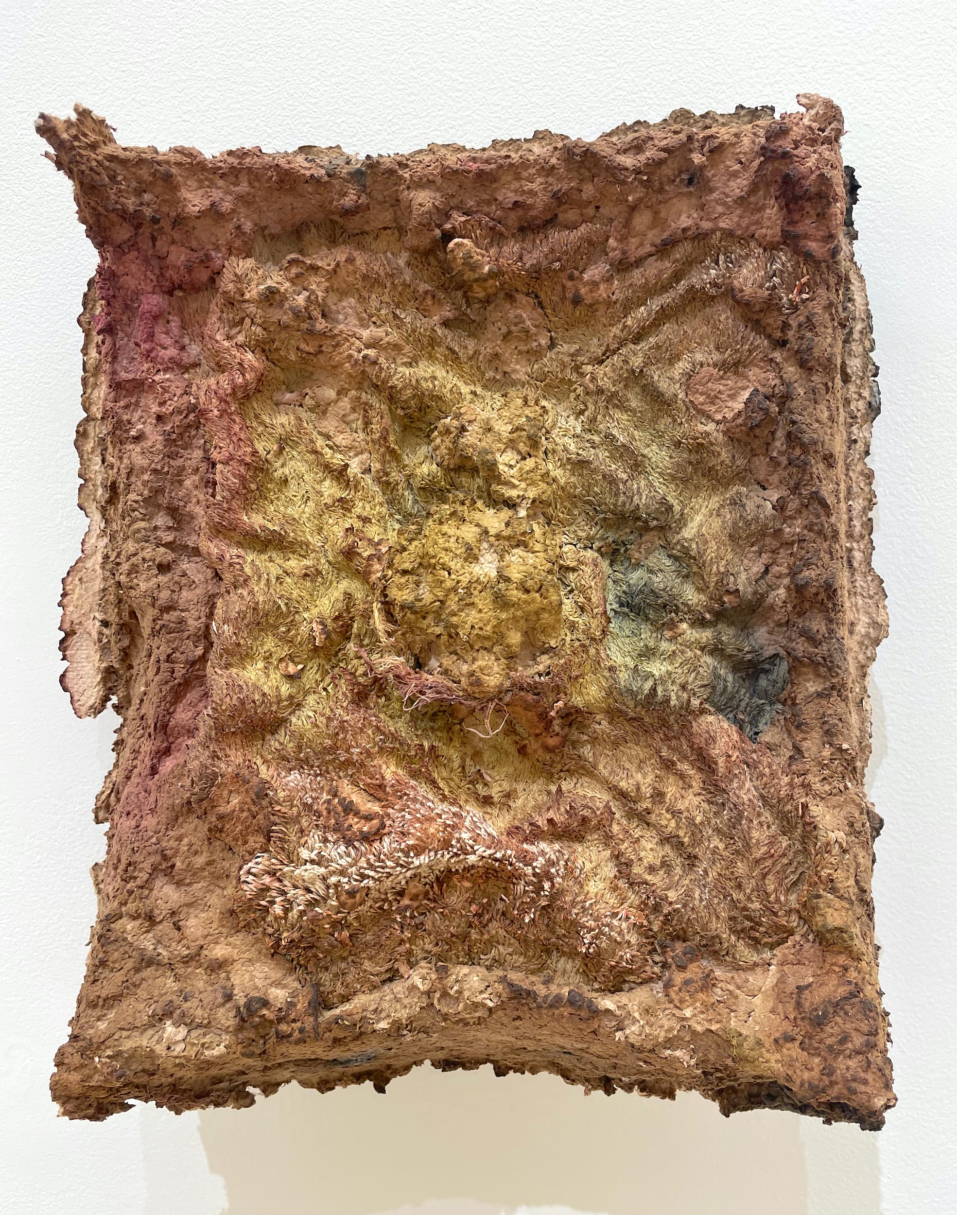 Decay meets more conventional artistic forms in Lauren Goldenberg Longoria’s Sweet Spit, an exhibit of 14 untitled, paper pulp works. These thick, rectangular reliefs layer handmade paper with studio waste like fuzzy fabric and foam, dyed in rich, almost neon hues. Holes proliferate across each expanse, and nails hammered through these gaps serve as untraditional mounts. Hung like paintings, Goldenberg Longoria’s sculptural forms destabilize — literally and figuratively — notions of medium and display, their half-destroyed “canvases” hovering at odd, gravity-defying angles from the gallery walls.