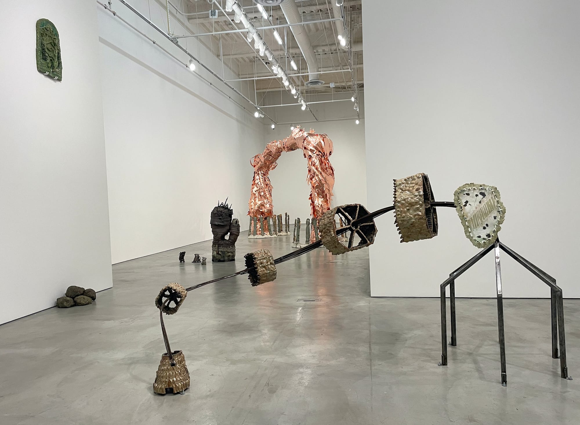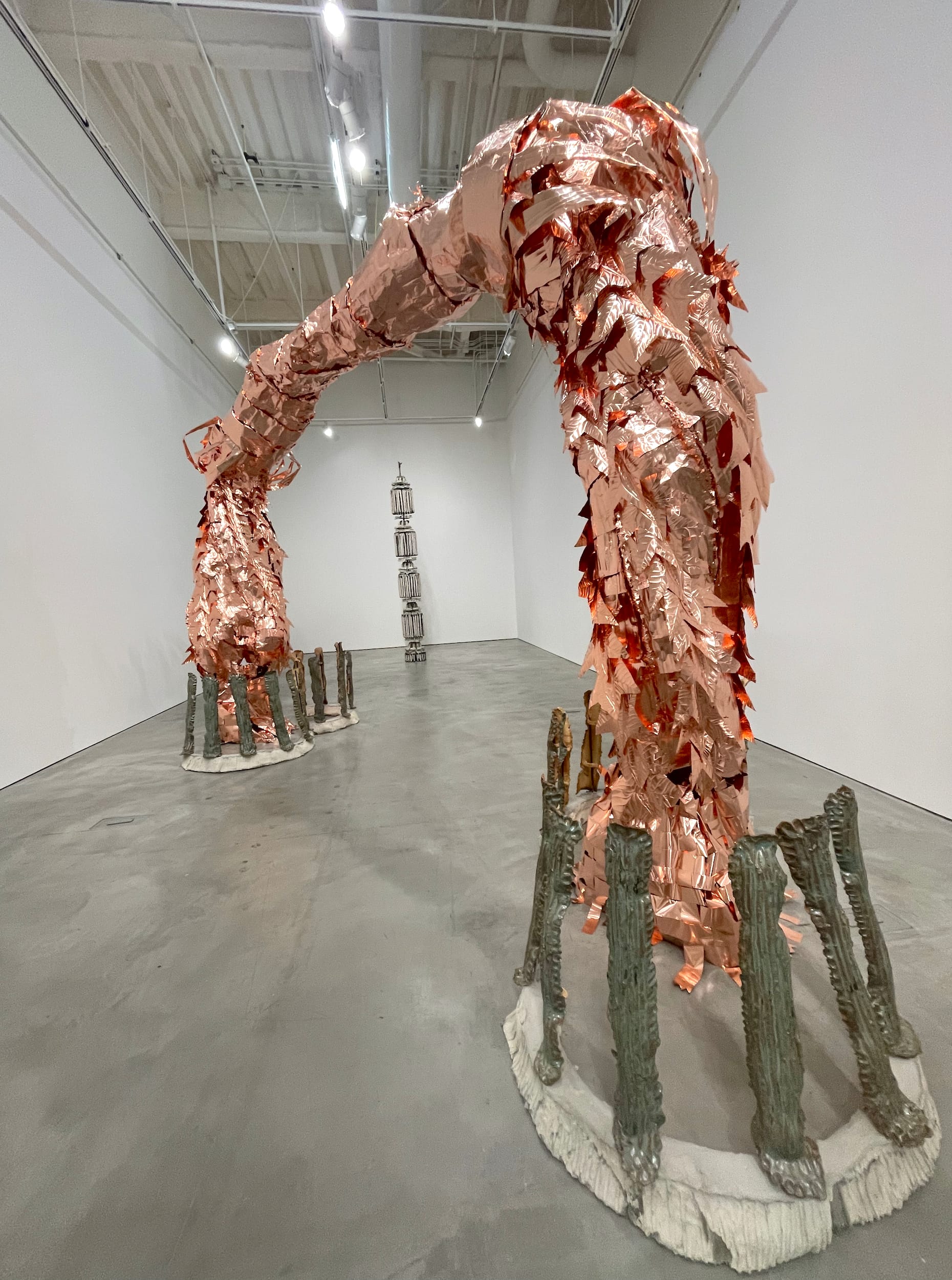 Liz Stringer’s sculpture series The Showings offers another take on the art gallery, employing large, near-architectural forms to transform her exhibition space into a post-apocalyptic, post-human landscape. In “Showing #4” (all works 2024), sculptures made from industrial materials and handcrafted ceramics evoke nonhuman creatures, their wormlike bodies wrapped in metal strips and adorned with molded clay. “Showing #5” looms above these alternate lifeforms: the piece is a towering archway constructed from copper foil, a material that will soon rust and turn the monumental work a moldy green — an ominous suggestion of the artwork’s eventual decomposition.