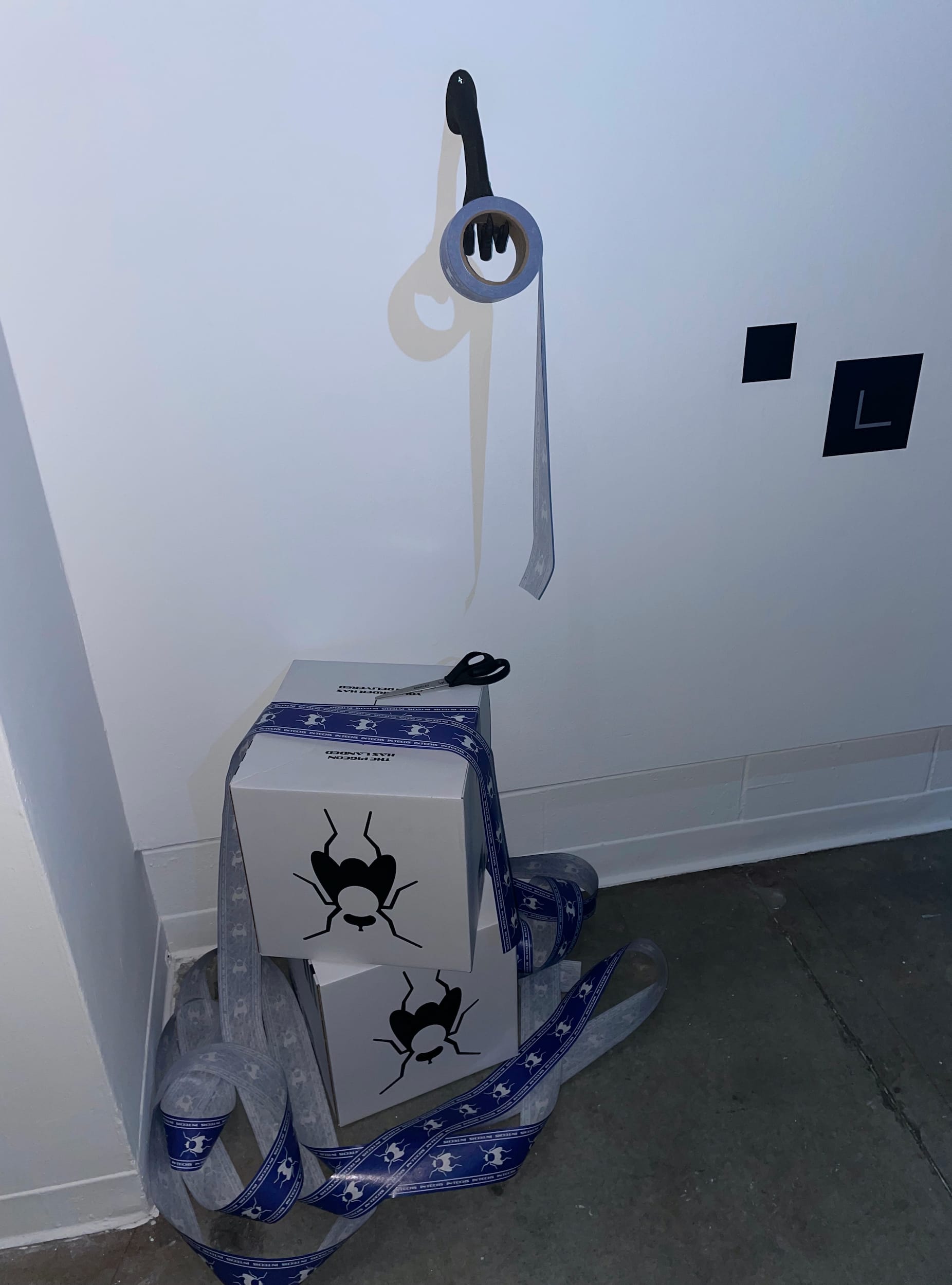 Devin Wilson’s The Pigeon Has Landed updates Nauman’s early video works for the Amazon era, transforming a dimly lit gallery into a creepy, high-tech warehouse serving a futuristic corporate entity. Hidden cameras project the viewer’s image onto small TV screens, boxes printed with an unfamiliar logo fill the corners, and a conveyer belt rotates off one wall, delivering nothing but, well, white, splattered bird shit. Here, the art institution is little more than a drop-shipper, an idea Wilson furthers with elaborate, confusing exhibition texts — pigeons, apparently, are “the symbolic nexus of capitalism” — that riff off of jargon-heavy press releases and exhibition texts.