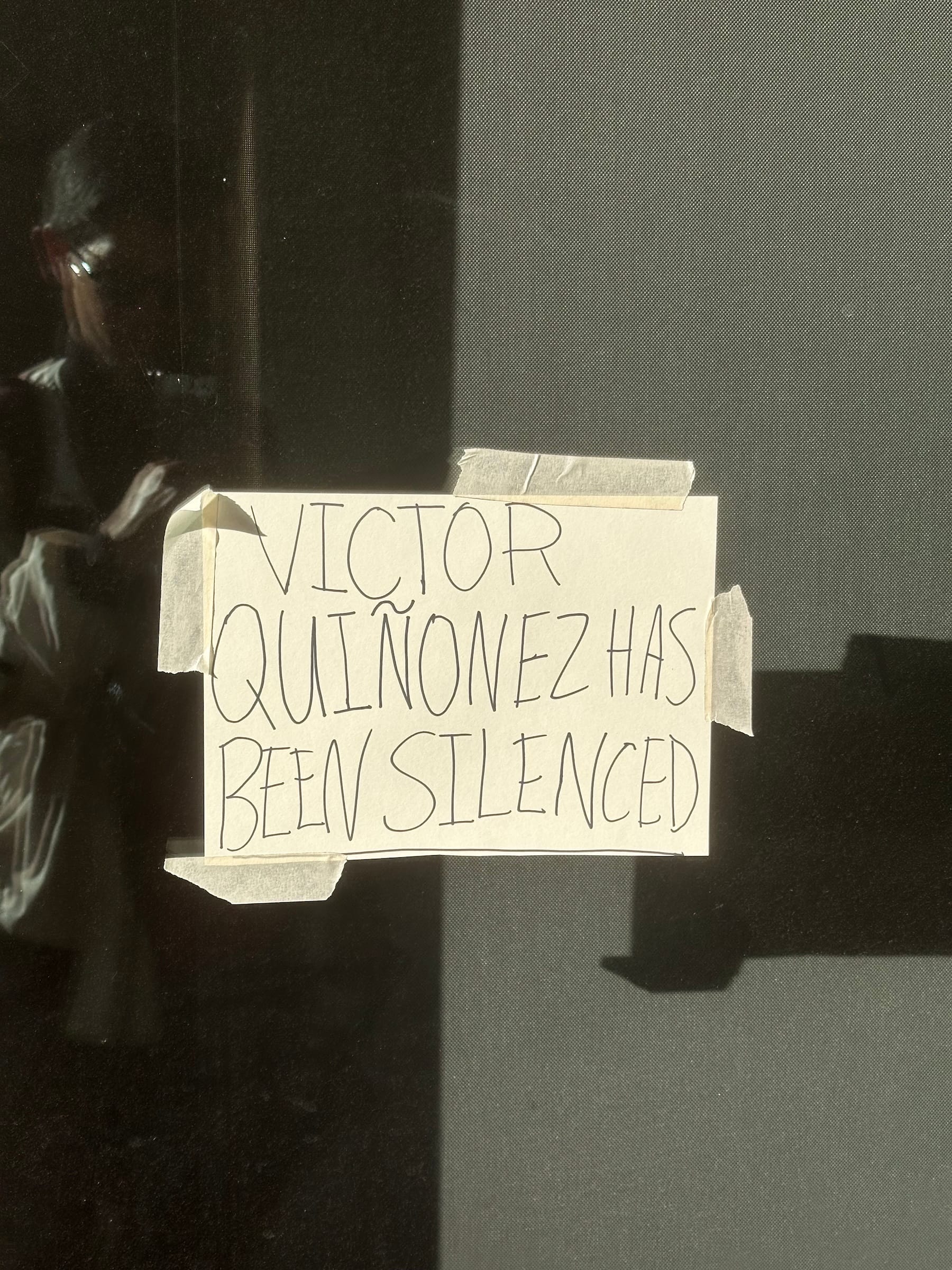 Hyperallergic spoke to Narong Tintamusik, an adjunct teacher in the Drawing and Painting department, who said he was on his way to teach his 5 pm class on Thursday when he saw a sign haphazardly taped to a gallery window. “Victor Quiñonez is being silenced,” the sign read. When Tintamusik got out of class later that evening, the sign had been taken down, he said.