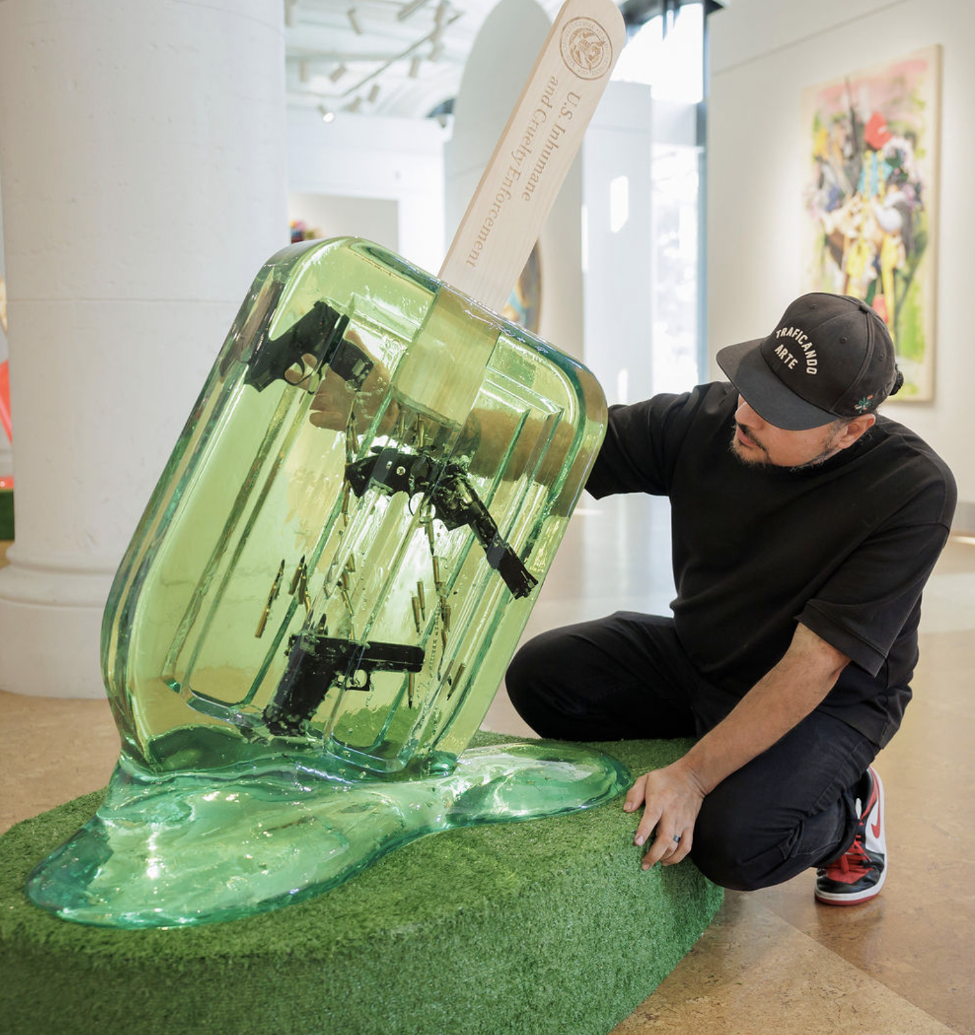Initially curated by Kate Fowle for Boston University Art Galleries, where it was on view for three months last year, the show notably included several works from Quiñonez's acclaimed I.C.E. Scream series — life-sized sculptures of paletas, or ice pops, that are both tributes to Latine immigrant culture and searing critiques of the violence inflicted by Immigration and Customs Enforcement (ICE). Certain pieces feature handcuffs or revolvers suspended in the transparent resin.