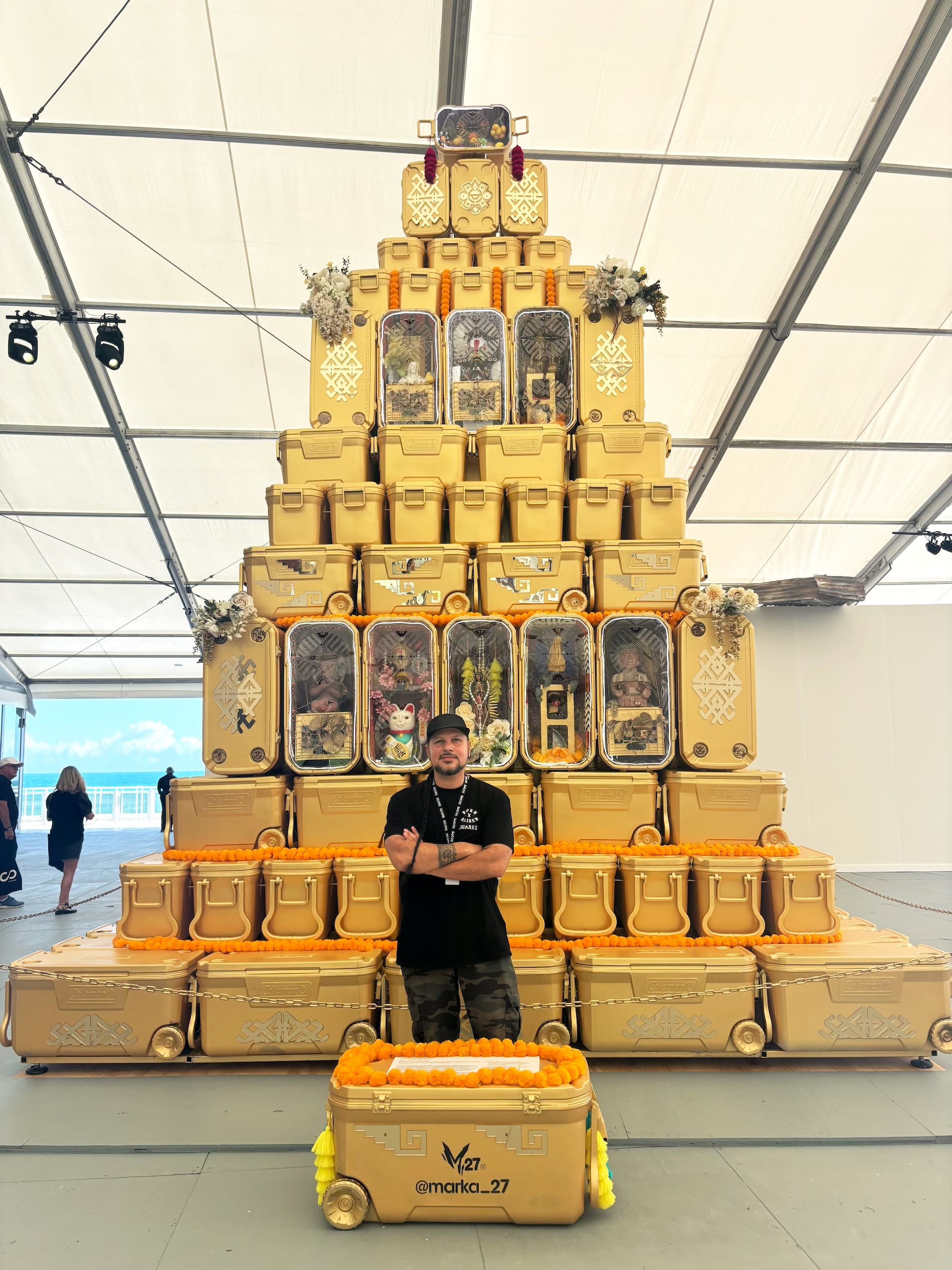 Ni de Aquí, Ni de Allá featured carefully rendered references to his community’s cultural footprint, from a bodega shelf lined with the tall devotional candles found in Latine and Caribbean households to a paleta cart in honor of street vendors.