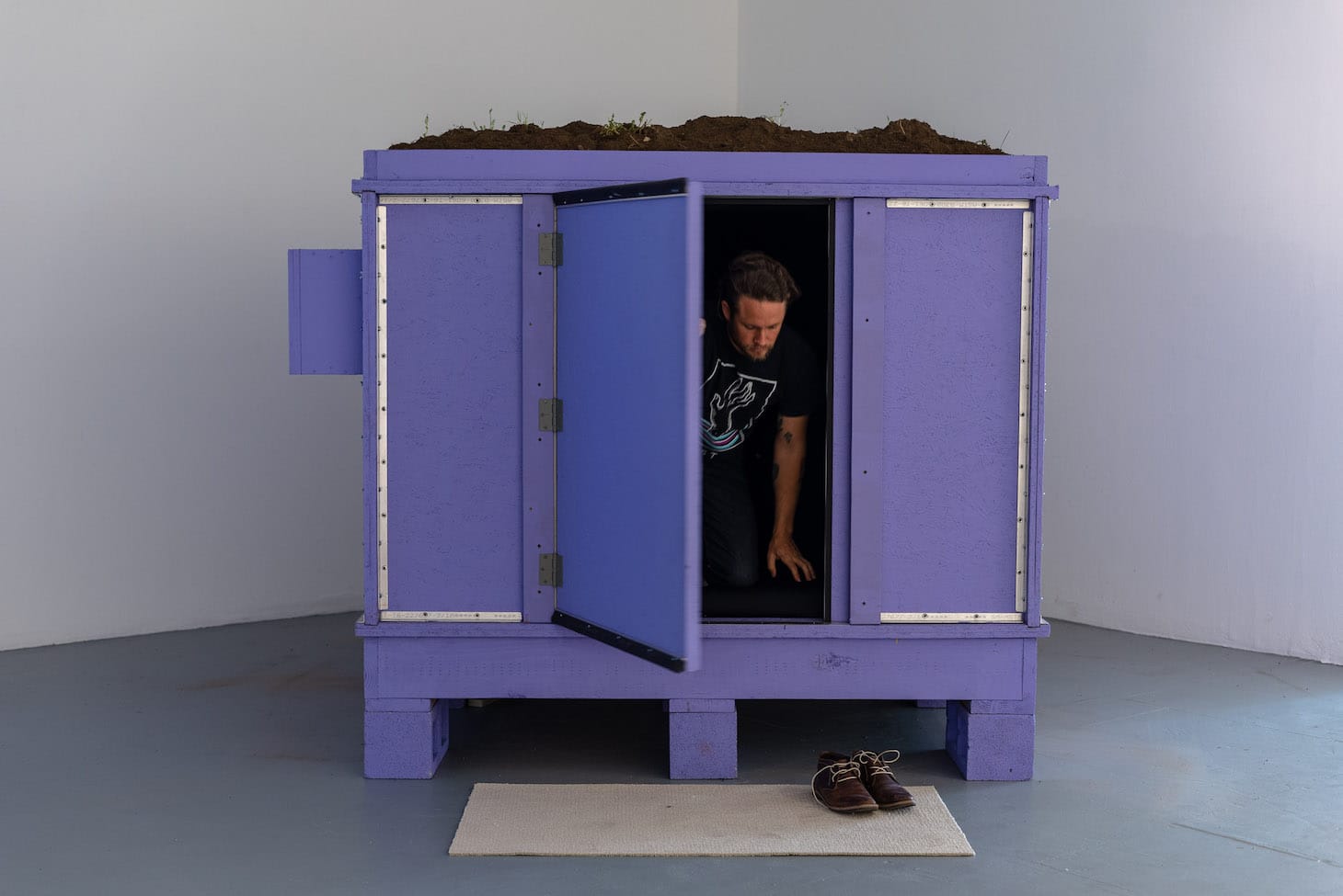 A few steps forward and you’re flanked by two distinct visions of the future that may well exist at the same time any day now. “My female lineage of environmental resistance,” a series of 100 portraits by Carolina Caycedo, presents a future influenced, if not shaped, by the activists she depicts with raised fists, mics in hand, or deep in thought. Their numbers and strength make their success seem inevitable until you turn your attention to the other side of the gallery, where Kim Zumpfe’s “a safe place for people i love or; How I Learned To Stop Worrying and Love Weathering the Storm” stands as a monument to an environmental apocalypse. Visitors are encouraged to enter this rectangular structure created out of soundproofing materials with straggly plants growing from its dirt roof. Enveloping you in a pitch-black interior, it seems like the ideal shelter to shut out any number of natural disasters.