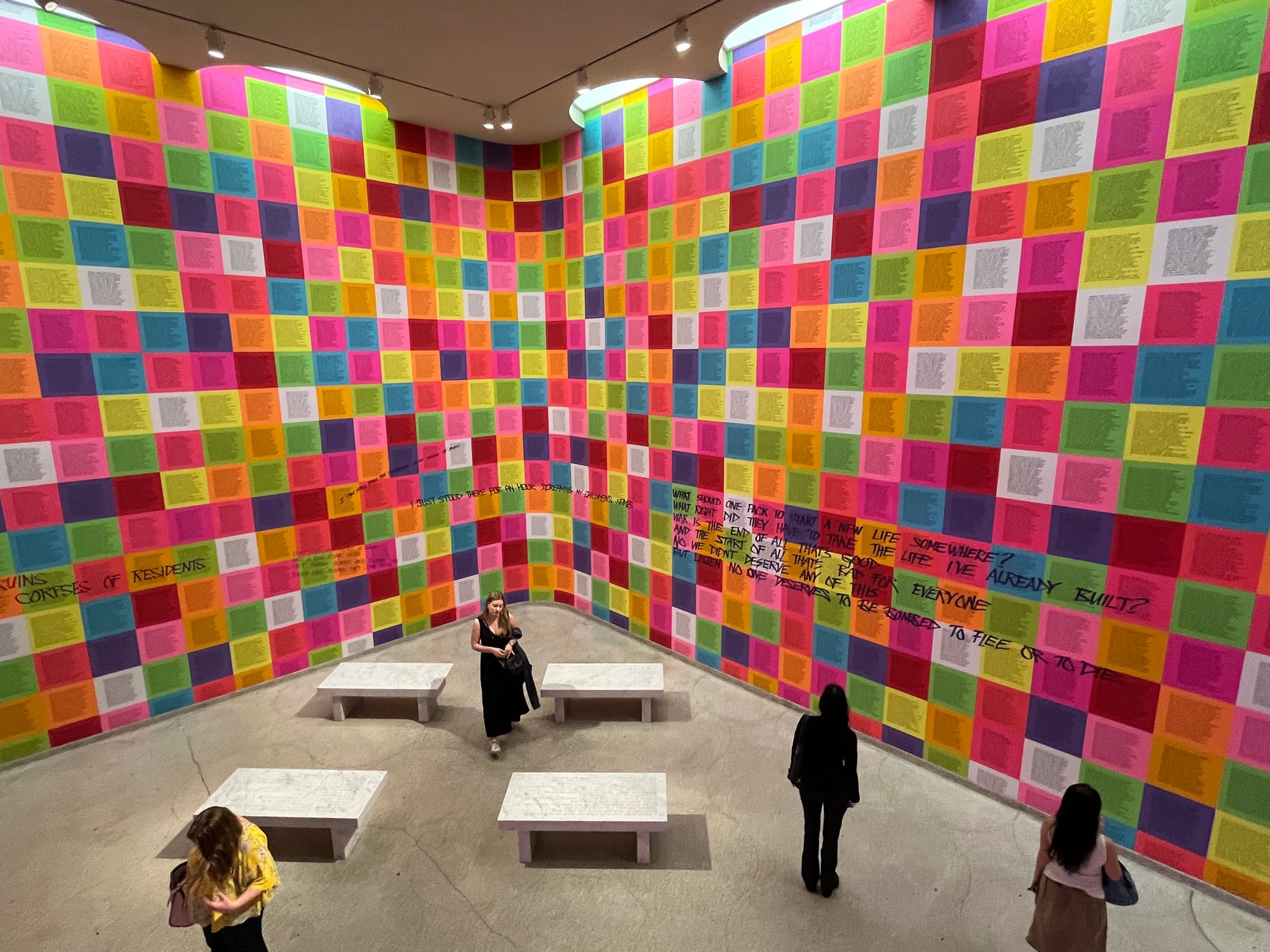 You wouldn't know it from walking through the exhibition, but these shattering lines, written by graffiti artist Lee Quiñones onto wheat-paste posters of Holzer's longer texts in a gallery on the first floor, are all from or about Gaza (alongside texts from war-torn Ukraine, Syria, and other locations). Only if you download and then navigate through the Bloomberg Connects phone app would you discover that the first line is a Gazan father quoted in a 2023 Human Rights Watch report; the second is a Gazan child speaking to a United Nations investigation into Israel's 2014 war on the city, which killed at least 2,251 Palestinians, among them 551 children and 299 women; and the third is from Kathy Engel's poem "Life Support" (1982) in the 2007 collection We Begin Here: Poems for Palestine and Lebanon (edited by Engel and Kamal Boullata).