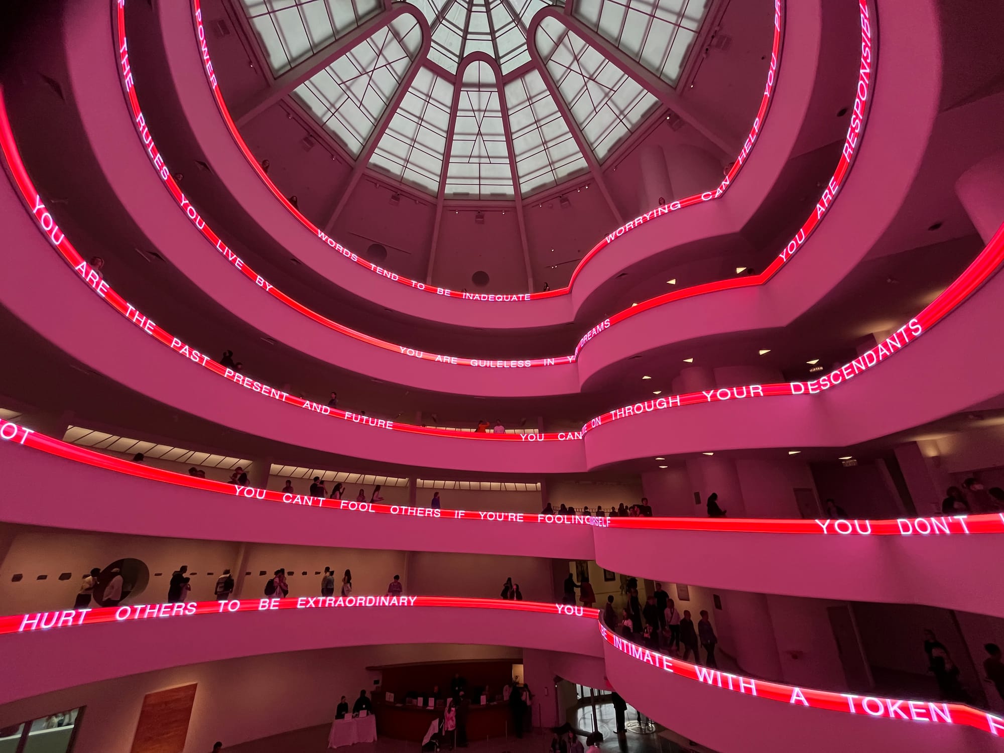 Jenny Holzer: Light Line continues at the Solomon R. Guggenheim Museum (1071 Fifth Avenue, Upper East Side, Manhattan) through September 29. The exhibition was curated by Lauren Hinkson, associate curator for Collections.