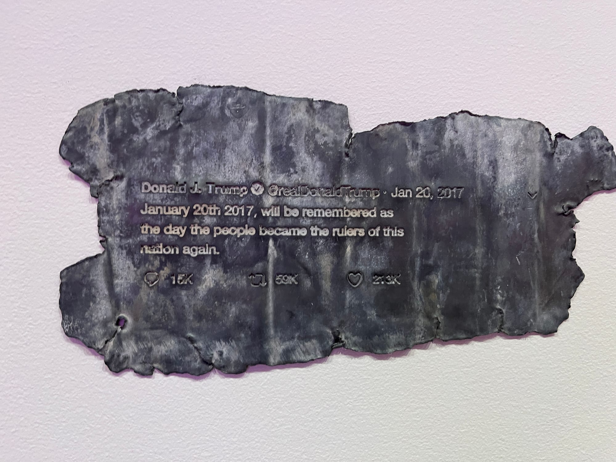 The artist's familiar stone benches, onto which more maxims are carved, and other previous works criticizing the US wars in Iraq and Vietnam are also included. So is a series of malignant Trump tweets stamped onto patinated lead and copper plates, which would've felt trite if not for the imminent danger of his comeback this November. But the best part of Light Line is the LED spiral, which has been touched up with new visual effects.