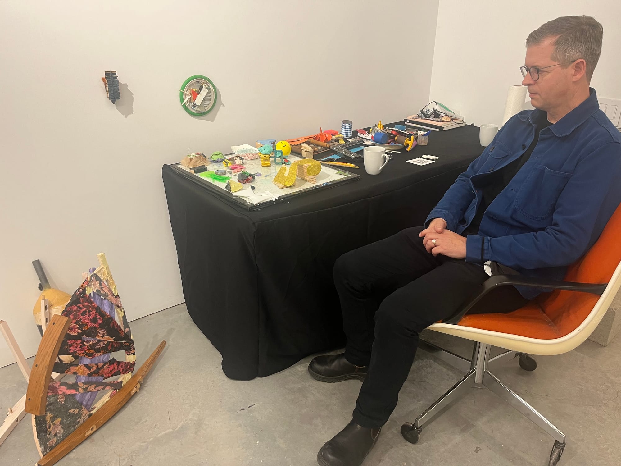 Demystifying creative inspiration is one of the chief virtues of seeing artists at work — certainly why so many other artists streamed into small studios like garcía’s, which at one point held almost a dozen curious visitors. At Art Cake, an artists’ space co-founded by Cordy and Ethan Ryman (sons of abstract and conceptual artist Robert Ryman), resident Jim Condron is transparent about how some of his petite, sculptural assemblage works come into being: through close work with artists, critics, and curators, who often supply him with five objects to build his piece.