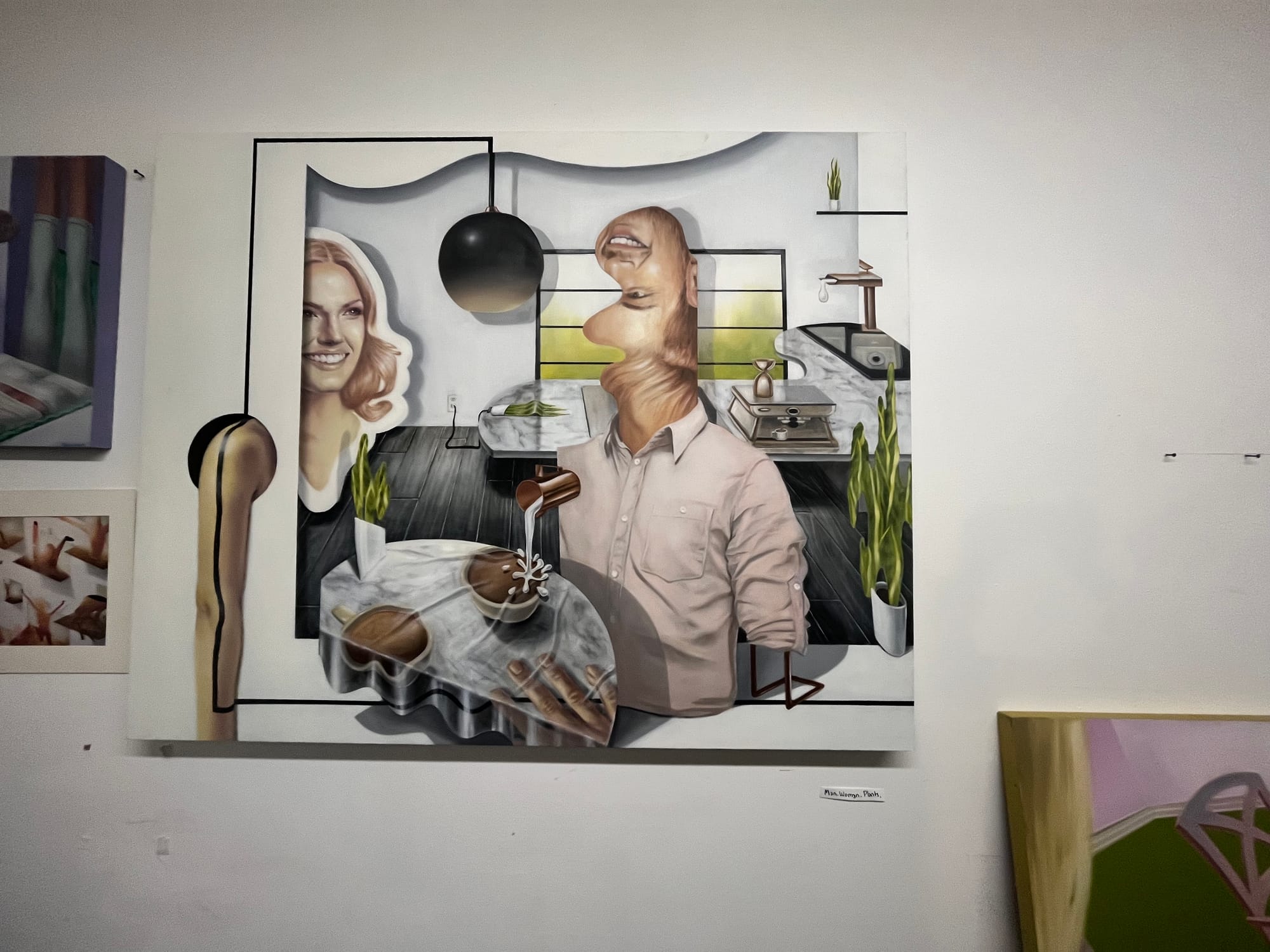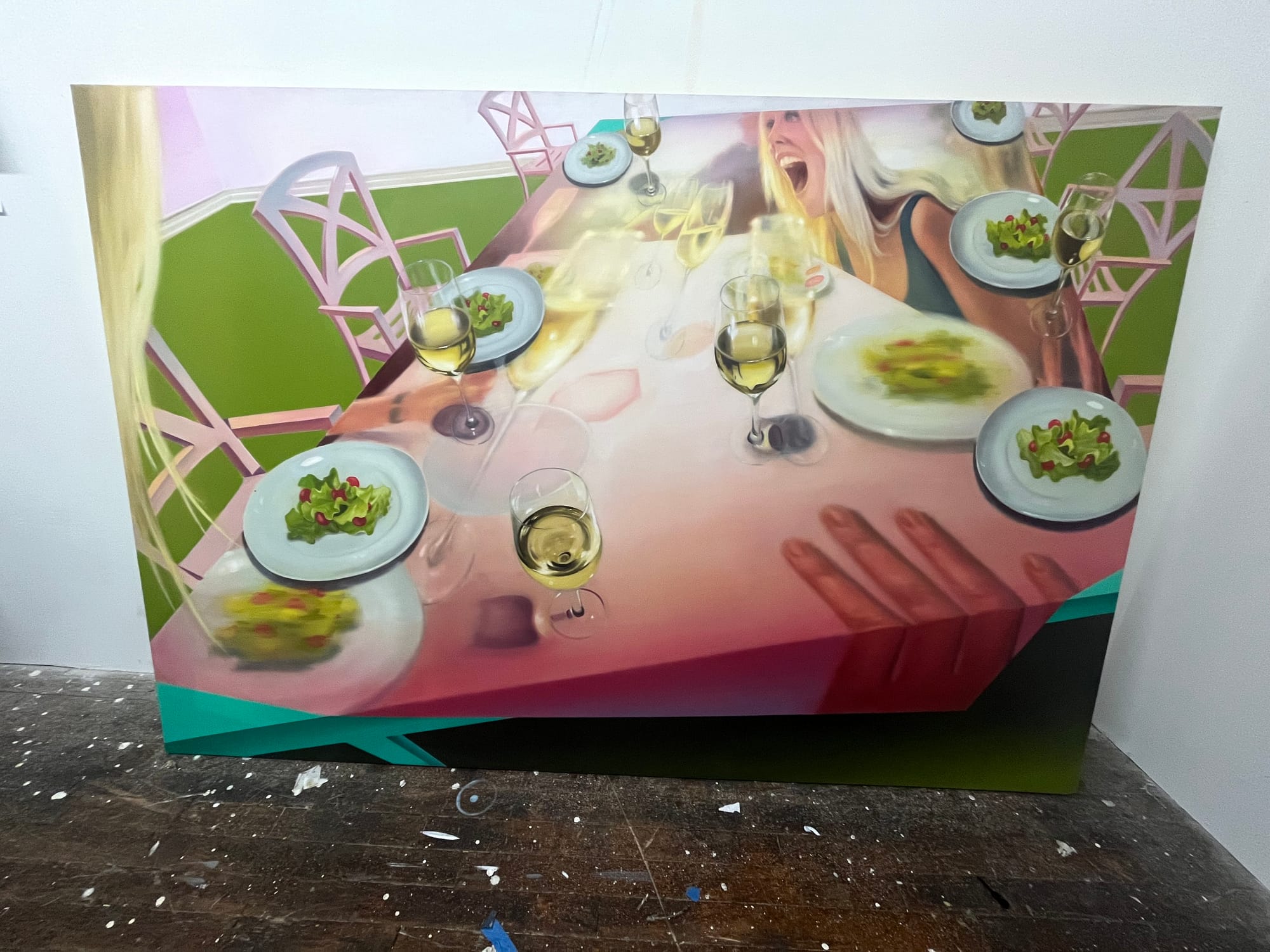 Next to “Man Woman Plants” is my favorite of Wiley’s works in the room, “Woman Laughing with Salad.” To my observation that it looks like something DALL-E could have generated, she replies, “that’s a very good compliment!”